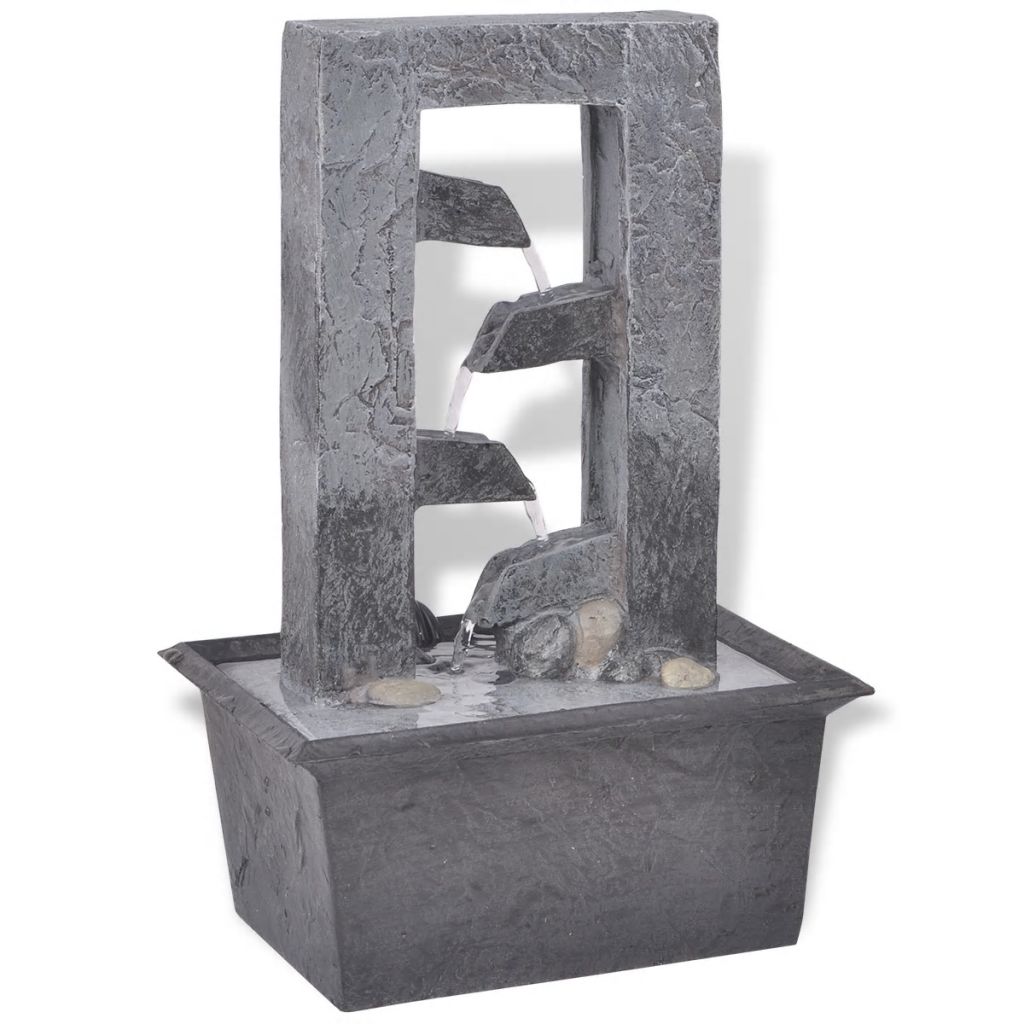 Dieser LED-Zimmerbrunnen ist eine ausgezeichnete Wahl, um eine natürliche Atmosphäre in Ihrem Wohnraum zu schaffen. Dieses rieselnde Wasserspiel wird jeden Dekor bereichern. Es ist LED beleuchtet, was, vor allem nachts, für einen wunderbaren visuellen Effekt sorgt. Hergestellt aus Polyresin, ist es UV-beständig, was bedeutet, dass es immer gut aussehen wird und bei direkter Sonneneinstrahlung seine Farbe behalten wird. Die vielen fließenden Wasserströme und das beruhigende Geräusch des tröpfelnden Wassers schaffen eine entspannende und meditative Atmosphäre. Die mitgelieferte, qualitativ hochwertige Pumpe sorgt für einen sicheren und zuverlässigen Betrieb. Dieses völlig eigenständige Wasserspiel kann überall in Ihrem Haus platziert werden.