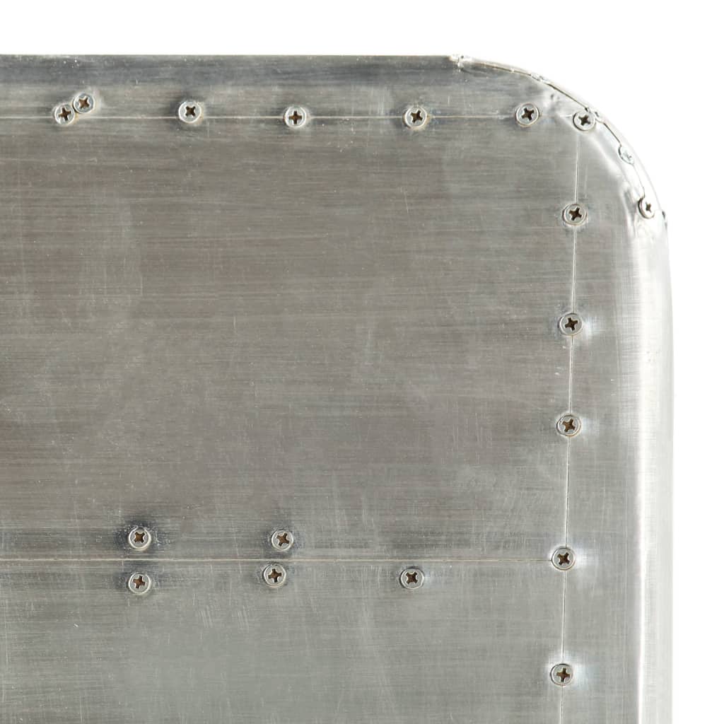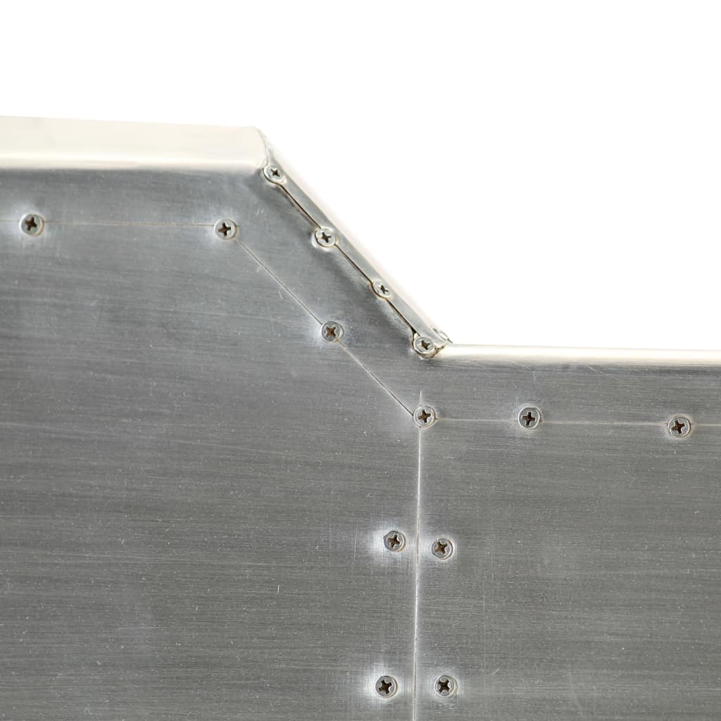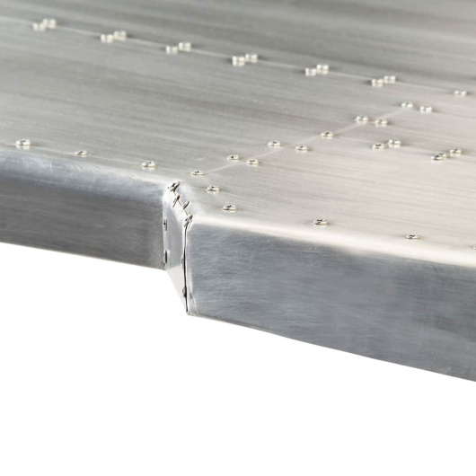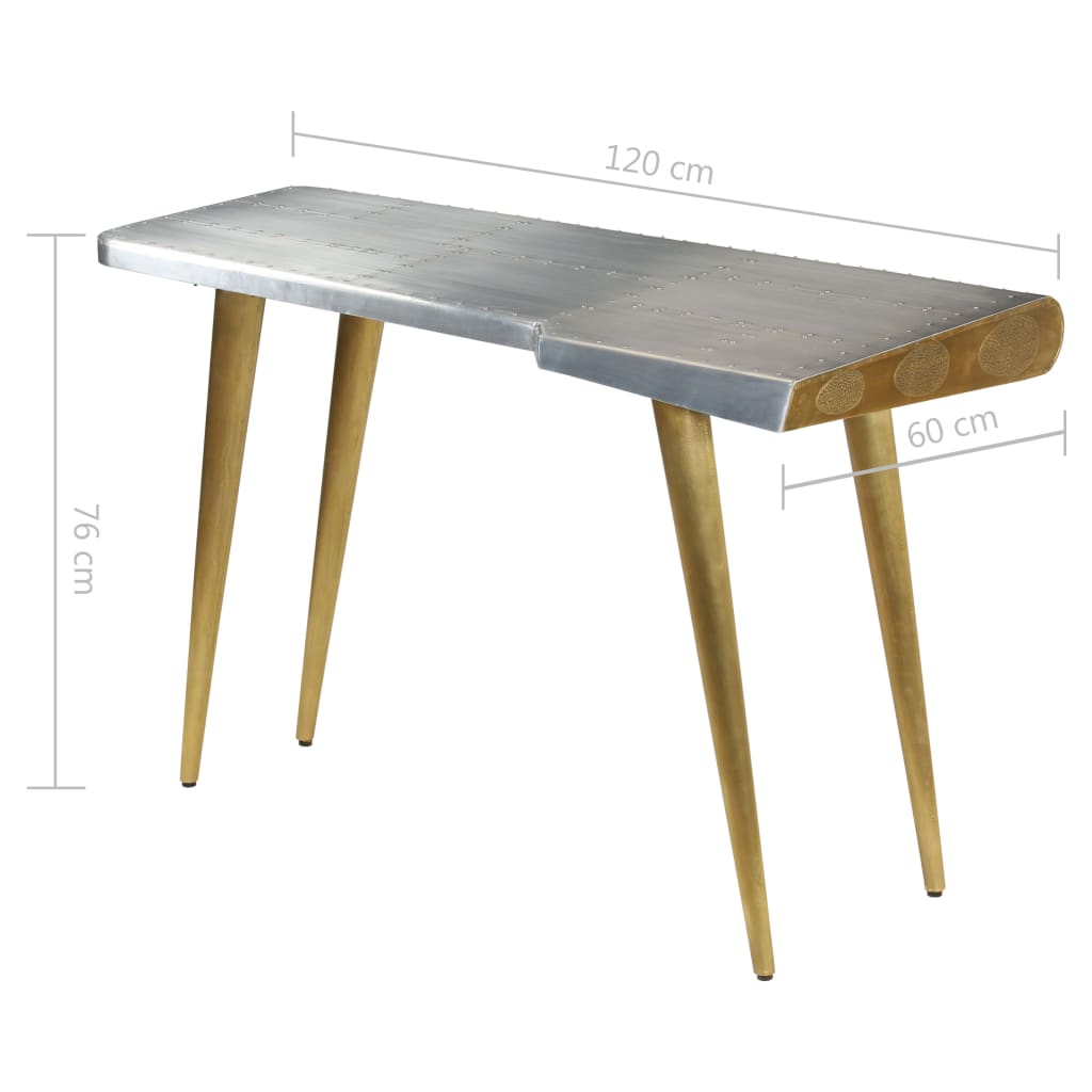 Dieser Schreibtisch im Vintage-Stil bringt mit seinem zeitlosen Design einen Hauch von Industrie-Stil in Ihr Arbeitszimmer oder Büro. Der Schreibtisch im Flugzeug-Stil ist aus massivem Mangoholz gefertigt, wobei die Oberfläche mit polierten Aluminiumblechen verkleidet und mit sichtbaren Stahlschrauben versehen ist, was ihn sehr strapazierfähig macht. Die Stahlbeine in Messing-Farbe und die gemusterten Nieten verleihen dem Fliegertisch einen industriellen Look. Zudem verfügt er über eine große Tischplatte, die Platz für Akten, Unterlagen, Bücher und andere Gegenstände bietet. Der Schreibtisch ist einfach zu montieren. Bitte beachten: Das Muster der Nieten kann von Stück zu Stück variieren, was jeden unserer Tische einzigartig macht; die Lieferung erfolgt in zufälliger Reihenfolge.