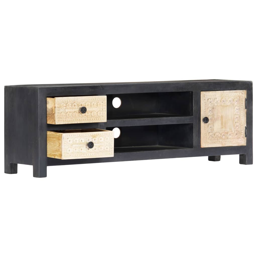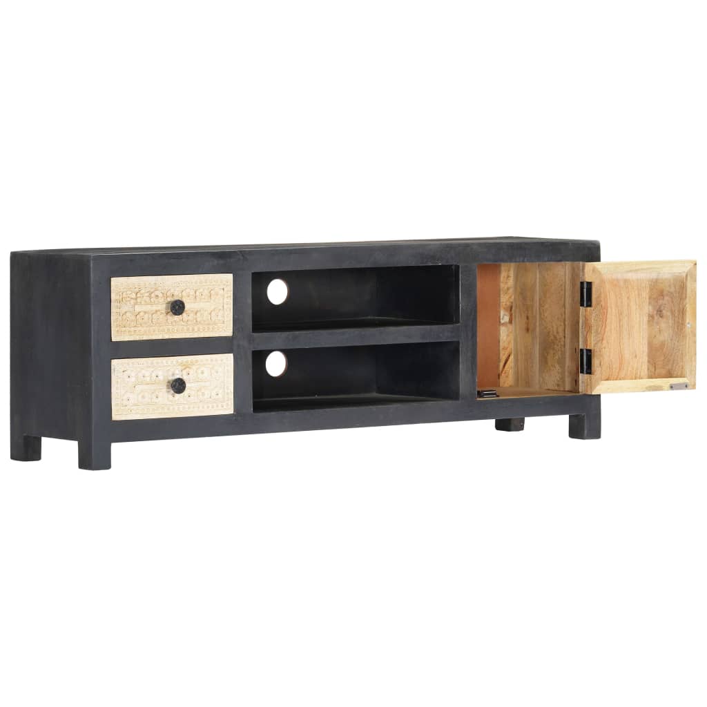 Bringen Sie den Luxus der Handschnitzerei mit unserem eleganten Holz-TV-Schrank in Ihr Zuhause! Ausgestattet mit 1 Tür, 2 Schubladen und 2 Fächern, die reichlich Stauraum bieten, ist dieser TV-Schrank sowohl eine praktische als auch eine dekorative Bereicherung für Ihr Wohn- oder Schlafzimmer. Aus massivem Mangoholz gefertigt, wurde der HiFi-Schrank mit einem schönen Finish durch Polieren, Anstreichen und Lackieren versehen, um eine raffinierte Optik aufzuweisen. Darüber hinaus unterstreichen die handgeschnitzten Muster auf der Tür und den Schubladen die Schönheit des Sideboards. Der Fernsehtisch lässt sich mit einem feuchten Tuch ganz einfach reinigen. Werten Sie Ihr Interieur mit unserem eleganten TV-Schrank auf!