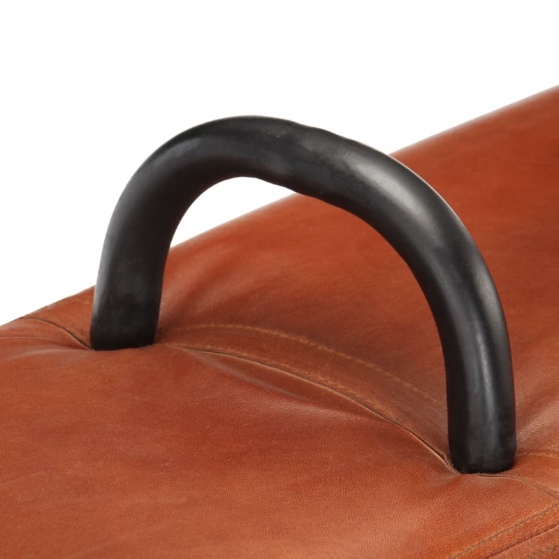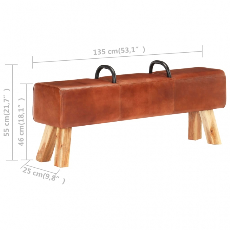 Diese Sitzbank im Turnstil der alten Schule ist sicherlich ein Unikat und soll ein Blickfang in Ihrem Zuhause oder anderen Räumen sein. Die stilvollen Metallgriffe bilden einen großen optischen Kontrast zur Polsterung aus echtem Ziegenleder. Diese Turnbockbank mit natürlich gemaserten Massivholzbeinen sorgt für einen hervorragenden Halt. Der anschmiegsame Bezug aus echtem Ziegenleder und die dicke Polsterung sorgen für bequemes Sitzen und machen die Bank zu einer praktischen und schicken Sitzoption.