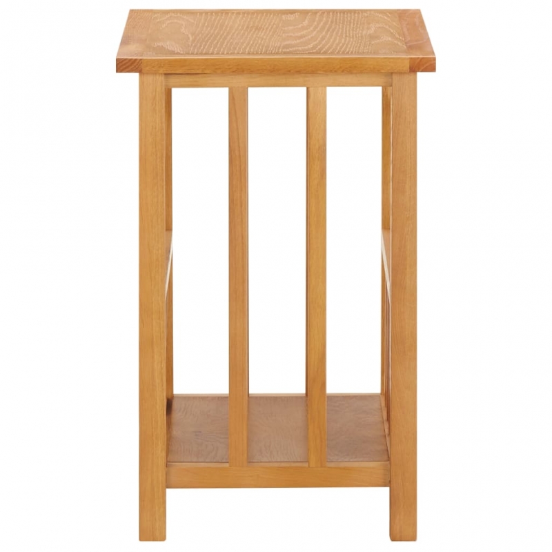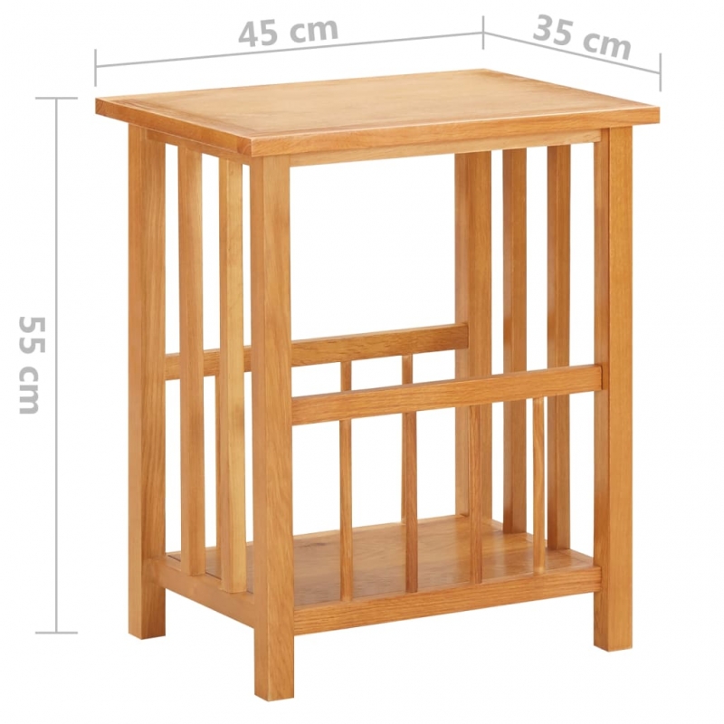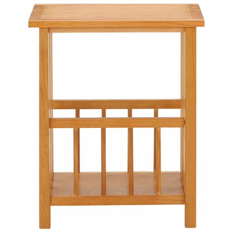Der Beistelltisch mit Zeitungshalter verfügt über ein schlichtes aber stilvolles Design und verleiht Ihrer Inneneinrichtung einen Hauch von rustikalem Charme. Dieser Beistelltisch mit Zeitungsablage wurde fachmännisch aus massivem Eichenholz und MDF gefertigt und ist somit langlebig und funktional. Dank seines kompakten Designs nimmt der Tisch sehr wenig Platz ein und lässt sich einfach umstellen. Die robuste Tischplatte bietet den idealen Platz, um Dekorationsartikel, Fotorahmen oder Topfpflanzen zur Schau zu stellen. Der Beistelltisch verfügt zudem über 1 Ablage, die sich perfekt zum Verstauen von Zeitungen und Zeitschriften eignet.