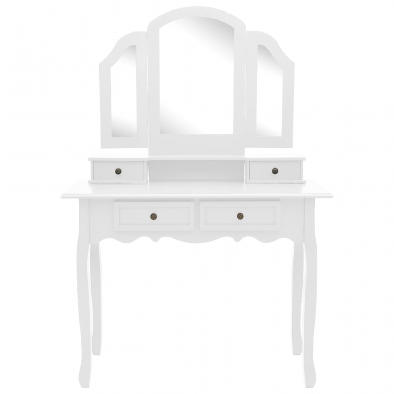 Unser charmantes Frisiertisch mit Hocker ist aus hochwertigem Paulownia-Holz gefertigt. Sein viktorianischer Stil und sein sauberes weißes Finish bringen Eleganz und Schönheit in Ihr Boudoir, Ihren persönlichen Salon oder Ihre Umkleidekabine. Die exquisite Verarbeitung ist ein weiteres herausragendes Merkmal dieses Tisch- und Hockersets. Dieser Schminktisch verfügt einen 3-in-1 Tischspiegel mit 2 Seitenspiegel mit dauerhaften Scharnieren, die sich zusammenklappen und auch in den gewünschten Winkel drehen lassen. Überraschenderweise können der Spiegelrahmen und der Tisch separat verwendet werden. Darüber hinaus bieten Ihnen die 4 schicken Schubladen reichlich Platz für Ihre Schmuckstücke, Kosmetika und andere wichtige Sachen. Dieses Set aus Schminktisch und Hocker ist sicherlich ein Hingucker, wo immer es hinkommt.