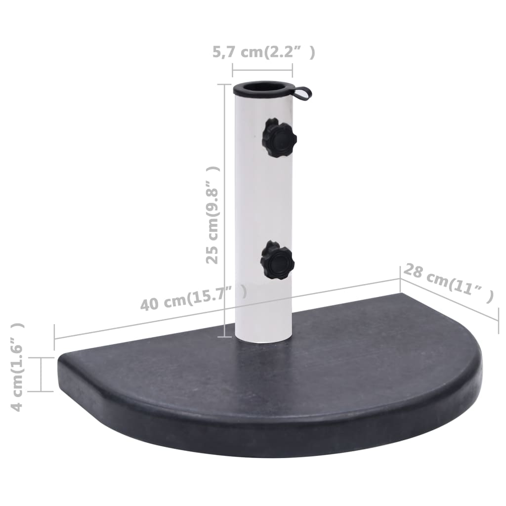 Dieser halbrunde Sonnenschirmständer bietet eine feste und robuste Basis, um Ihren Sonnenschirm zu halten und gleichzeitig zu verhindern, dass er umkippt oder weggeblasen wird. Der Schirmständer verfügt über eine langlebige Granitkonstruktion, die dank ihres hohen Gewichts sehr stabil ist. Granit sorgt für eine luxuriöse Optik und Haptik und verleiht dem gesamten Schirm so einen raffinierten Look und Ihrem Außenbereich einen Hauch von Eleganz. Ergänzen Sie also Ihre Gartenmöbel mit diesem erstklassigen Schirmständer. Das Rohr besteht aus Edelstahl. Die mitgelieferten Adapter passen zu Sonnenschirmstangen mit einem Durchmesser von 38 mm bzw. 48 mm. Die Befestigung des Sonnenschirms am Ständer ist ein Kinderspiel und ihr Schirm steht fortan kerzengerade.