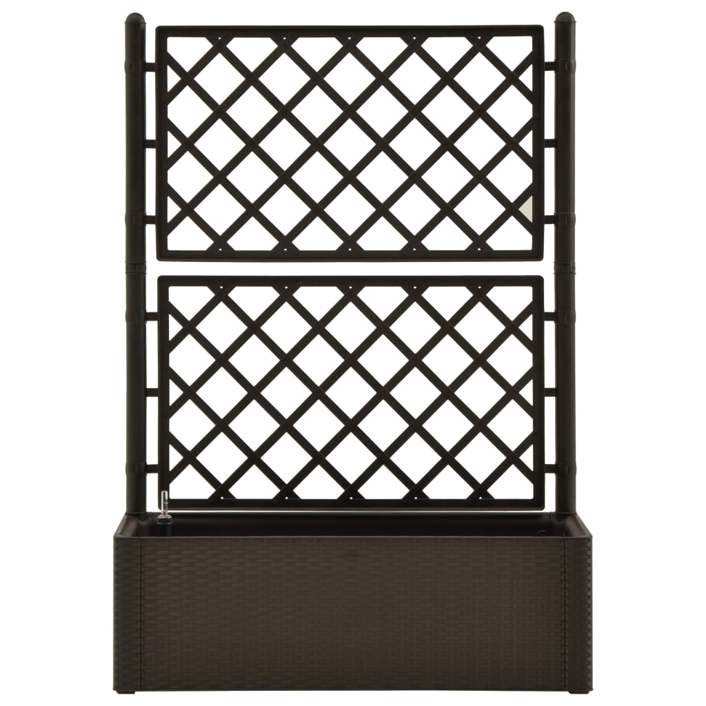 Schaffen Sie einen schönen Hingucker mit diesem eleganten, funktionalen und einzigartigen selbstbewässernden Hochbeet! Dieser Spalier-Pflanzkübel hat einen großen Blumenkasten, der eine große Anzahl grüner Pflanzen und Blumen aufnehmen kann. Das eingebaute Spalier bietet eine hervorragende Stütze für Kletterpflanzen wie Kräuter, Tomaten, Bohnen usw. Es besteht aus robustem UV-, wetter- und frostbeständigem Kunststoff und ist für den Innen- und Außenbereich geeignet. Das Design ähnelt einer täuschend realen Rattanstruktur. Das Material ist waschbar und leicht zu reinigen. Darüber hinaus kann diese Box Pflanzen automatisch gießen, indem sie Feuchtigkeit aus ihrem 90-l-Wasserreservoir ableitet, und verfügt über Wasserüberlauflöcher, um ein Überwässern zu verhindern. Die Füllstandsanzeige ist enthalten.