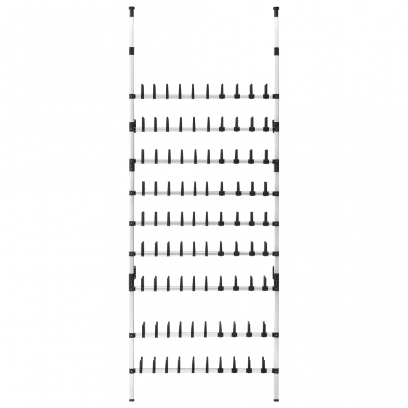 Dieses minimalistische Schuhregal ist eine ideale Aufbewahrungslösung für Ihre Schuhe. Das Teleskop-Schuhregal ist aus Aluminium hergestellt und ist dadurch stabil und robust. Diese Aufbewahrungseinheit kann dank ihres Teleskopsystems und der einstellbaren Höhe und Breite an unterschiedliche räumliche Anordnungen angepasst werden. Es bietet eine einzigartige und vielseitige Möglichkeit, Ihre Schuhe ordentlich, organisiert und platzsparend aufzubewahren. Dieses Schuhregal bietet Platz für 90 Paar Schuhe.