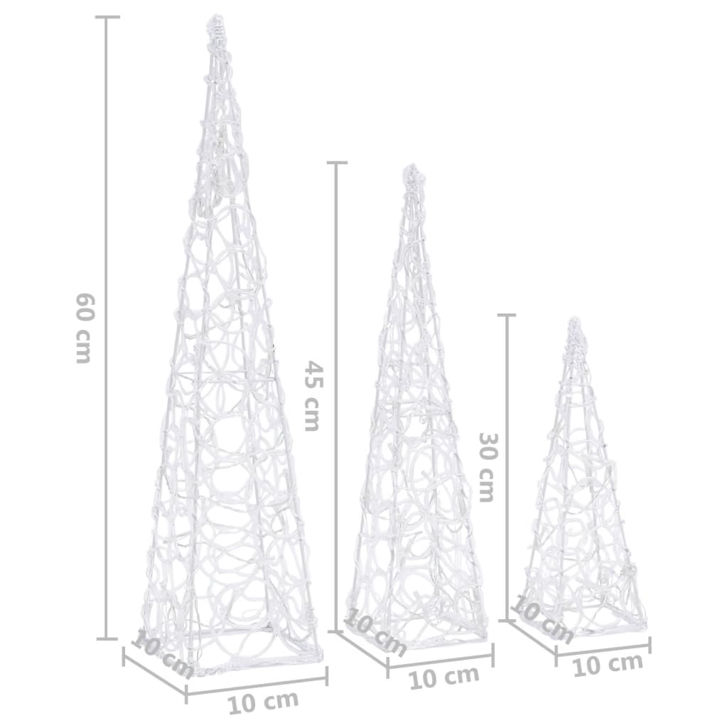 Mit diesem LED-Leuchtkegel-Set schaffen Sie drinnen und draußen eine gemütliche und festliche Atmosphäre für Weihnachtsfeiertage. Das Set enthält 3 Leuchtkegel mit unterschiedlicher Höhe. Das Gehäuse dieses dekorativen Leuchtkegels besteht aus Acryl, das ihm einen luxuriösen, eisigen und glänzenden Look verleiht, der die Umgebung aufhellt. Mit energiesparenden LEDs ausgestattet, sorgt er für eine helle und leistungsstarke Beleuchtung. Er verfügt über 8 verschiedene Lichteffekte: Kombinationsmodus, Wellen, Sequenzmodus, langsam leuchtender Modus, blinkend, langsame Ausblendung, Funkeln und ununterbrochene Beleuchtung. Dieses schöne Weihnachtskegel-Set und das mitgelieferte Batteriefach sind wasserdicht, wodurch das Produkt sowohl für den Innen- als auch für den Außenbereich geeignet ist.