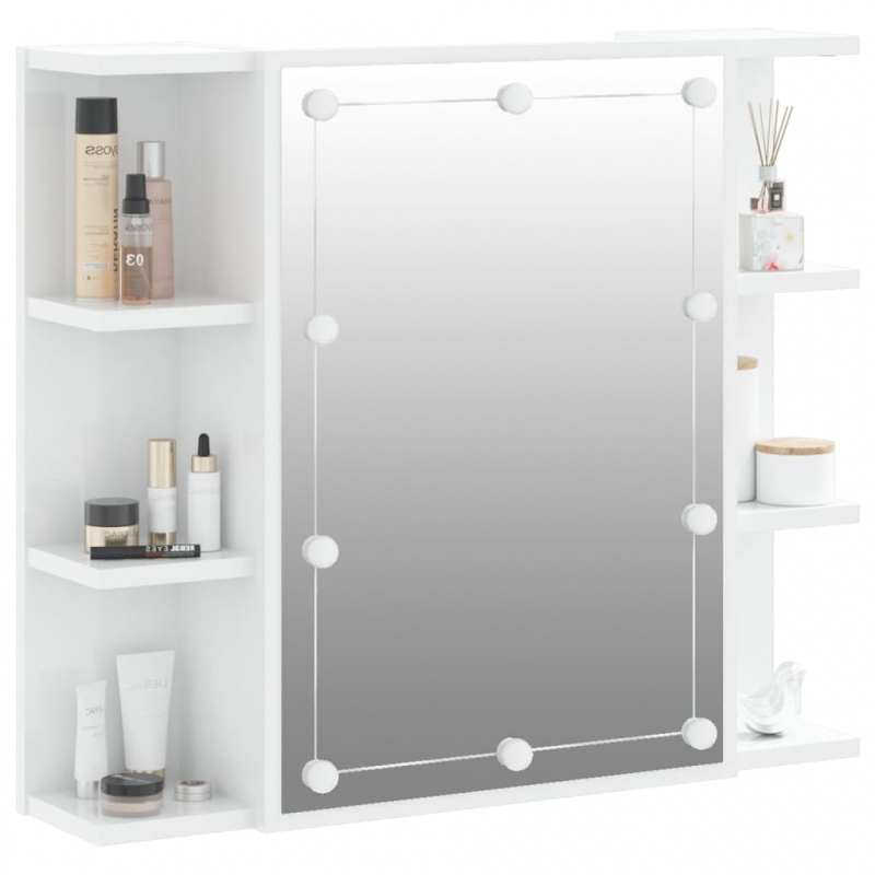 Mit diesem trendigen Spiegelschrank mit LED-Beleuchtung kannst du deine Schminkutensilien ordentlich und griffbereit aufbewahren! Langlebiges Material: Holzwerkstoff ist ein Material hoher Qualität mit glatter Oberfläche, das sich durch Festigkeit, Stabilität und Feuchtigkeitsbeständigkeit auszeichnet. Aus Holzwerkstoff gefertigt, lässt sich dieser Spiegelschrank mit LEDs leicht reinigen.Praktischer Spiegel: Der schöne Spiegel bietet eine klare Sicht beim Auftragen von Make-up und verleiht dem Badschrank eine elegante Note.LED-Leuchten: Der Wandschrank verfügt über LED-Lampen, die mit einer USB-Schnittstelle ausgestattet sind, was eine bequeme Bedienung gewährleistet.Viel Stauraum: Dieser Spiegelschrank verfügt über Fächer, die reichlich Platz zur ordentlichen Aufbewahrung deiner Sachen bieten. Hinweis:Jedes Produkt wird mit einer Montageanleitung in der Verpackung für eine einfache Montage geliefert.Schrauben und Dübel für die Wandbefestigung sind nicht enthalten. Suchen und verwenden Sie die für Ihre Wände geeigneten Schrauben und Dübel. Wenn Sie unsicher sind, suchen Sie professionelle Hilfe. Lesen und befolgen Sie jeden Schritt der Anleitung sorgfältig.