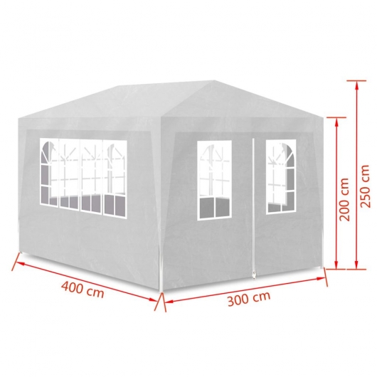 Das Partyzelt wird sich als wunderbarer Ort erweisen, an dem sich Ihre Familie und Freunde bei Gartenpartys und Zusammenkünften immer gut fühlen werden. Das Gartenzelt besteht aus UV- und wasserbeständigem Polyethylen und ist daher für den Einsatz im Freien bestens geeignet. Der Rahmen ist aus rostfreiem Stahl gefertigt, wodurch das Partyzelt stabil und langlebig ist. Das Partyzelt hat Seitenverkleidungen mit jeweils dekorativen Fenstern und 1 Türverkleidung mit Reißverschluss für einen einfachen Zugang. Der Gartenpavillon ist einfach zu montieren. Hinweis: Dieser Artikel sollte NIEMALS bei rauen Wetterbedingungen, wie starkem Wind, Regenschauer, starkem Schneefall, Sturm, Hagel, usw., genutzt werden.