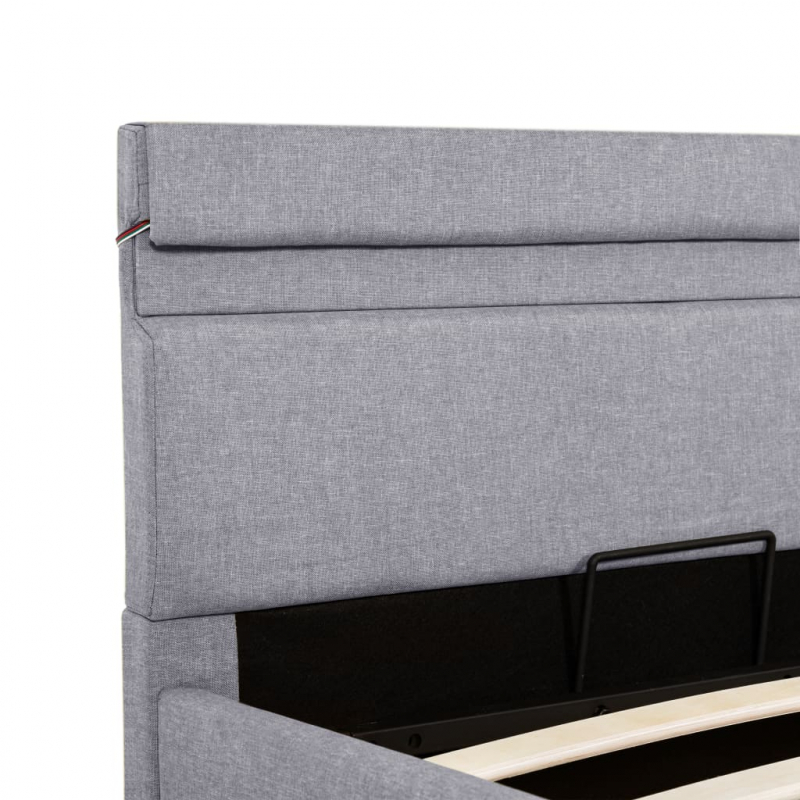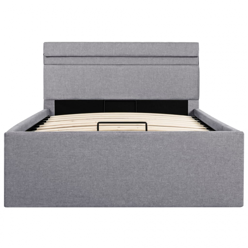 Verleihen Sie Ihrem Schlafzimmer mit diesem hydraulischen Bettgestell aus Stoff sofort ein beeindruckendes und modernes Aussehen! Dieses Einzelbett zeichnet sich durch ein schlichtes und zugleich stilvolles Design sowie einer soliden Konstruktion aus, da es aus starkem und robustem MDF gefertigt ist. Dieses Polsterbett verwandelt den ungenutzten Raum unter der Matratze in einen Stauraum mit viel Platz zur Aufbewahrung von Kleidung, Laken, Decken usw. Der hydraulische Gashebemechanismus macht das Anheben der Matratze zum Kinderspiel. Der Lattenrost steht nach dem Anheben aufrecht, sodass du beide Hände frei hast, um darunter liegende Gegenstände zu entfernen oder zu verstauen. Der Bettrahmen aus pulverbeschichtetem Stahl und die Latten aus Sperrholz verleihen dem Bett zusätzliche Robustheit und Langlebigkeit. Mit einem Bezug aus glänzendem Kunstleder versehen, wirkt dieses Bett mit Bettkasten einladend und ist pflegeleicht. Dieses Boxspringbett ist für eine Matratze von 100 x 200 cm ausgelegt. Zudem kannst du mit der mitgelieferten 24-Tasten-Fernbedienung bequem die Leistung, die Helligkeit und die verschiedenen Lichtfarben der LED-Beleuchtung einstellen, um eine atemberaubende Atmosphäre zu erzeugen. Dieses Produkt ist einfach zu montieren. Bitte beachte, dass im Lieferumfang nur das Bettgestell enthalten ist. Eine Matratze ist nicht im Lieferumfang enthalten. In unserem Shop findest du die passenden Matratzen. Hinweis: Das Produkt verfügt über einen USB-Anschluss, aber die zertifizierte 5-V-USB-Stromquelle ist nicht im Lieferumfang enthalten.