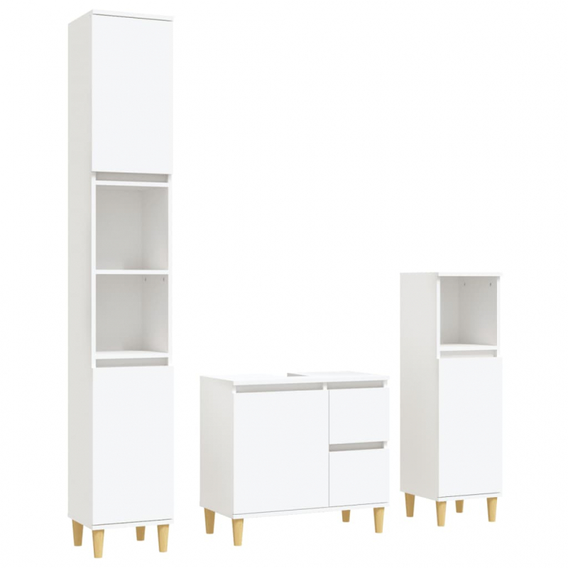 Dieses attraktive Badmöbel-Set mit viel Stauraum weist ein stilvolles und zugleich praktisches Design auf. Langlebiges Material: Holzwerkstoff ist ein Material von außergewöhnlicher Qualität mit glatter Oberfläche, das sich durch Festigkeit, Stabilität und Feuchtigkeitsbeständigkeit auszeichnet. Ausreichend Stauraum: Das Badmöbel-Set bietet viel Platz, um deine Sachen organisiert und ordentlich aufzubewahren. Holzbeine: Die Beine aus massivem Eukalyptusholz verleihen dem Badschrank eine natürliche und angenehme Optik und sorgen gleichzeitig für Stabilität.Einfache Reinigung: Das Badmöbel-Set lässt sich leicht mit einem feuchten Tuch reinigen.Stilvolles Design: Die klaren Linien und das schlanke Design fügen sich perfekt in dein Badezimmer ein. Achtung:Um ein Umkippen zu vermeiden, sollte dieses Produkt mit der mitgelieferten Wandhalterung gesichert werden. Gut zu wissen:Schrauben und Dübel sind für die Befestigung an der Wand nicht im Lieferumfang enthalten. Wir empfehlen, speziell für deine Wände geeignete Schrauben und Dübel zu finden und zu verwenden. Im Zweifelsfall wende dich an einen Fachmann. Bitte lese und befolge jeden Schritt der Anweisungen.