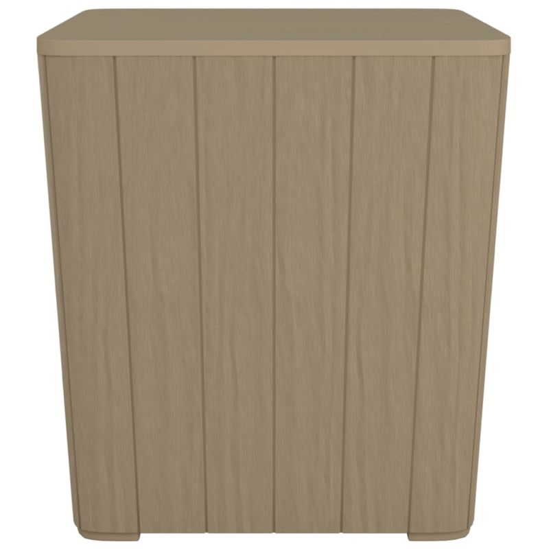 Dieser stilvolle Gartentisch mit praktischem Staufach und abnehmbarer Tischplatte ist eine ideale Ergänzung zu deinem Außenbereich. Langlebiges Material: Polypropylen (PP) ist ein beliebter Kunststoff, der häufig bei der Herstellung von Gartenmöbeln verwendet wird. Dieses Material ist leicht, robust und stoßfest. Dank seiner UV- und Witterungsbeständigkeit lässt es sich auch einfach reinigen und pflegen.Design in Holz-Optik: Mit seinem Design in Holz-Optik verleiht der Gartentisch deinem Außenbereich einen Hauch Natürlichkeit.Zusätzlicher Stauraum: Der Gartentisch verfügt über ein Staufach unter der abnehmbaren Tischplatte, das sich perfekt eignet, um verschiedenen wichtige Sachen griffbereit und ordentlich aufzubewahren.Praktischer Deckel: Wenn der Deckel als Tischplatte geschlossen ist, eignet sich der robuste Balkontisch perfekt, um Handy, Bücher, Snacks oder Getränke griffbereit zu halten. Hinweis:Damit deine Gartenmöbel lange schön bleiben, empfehlen wir dir, sie mit einer wasserdichten Hülle zu schützen.