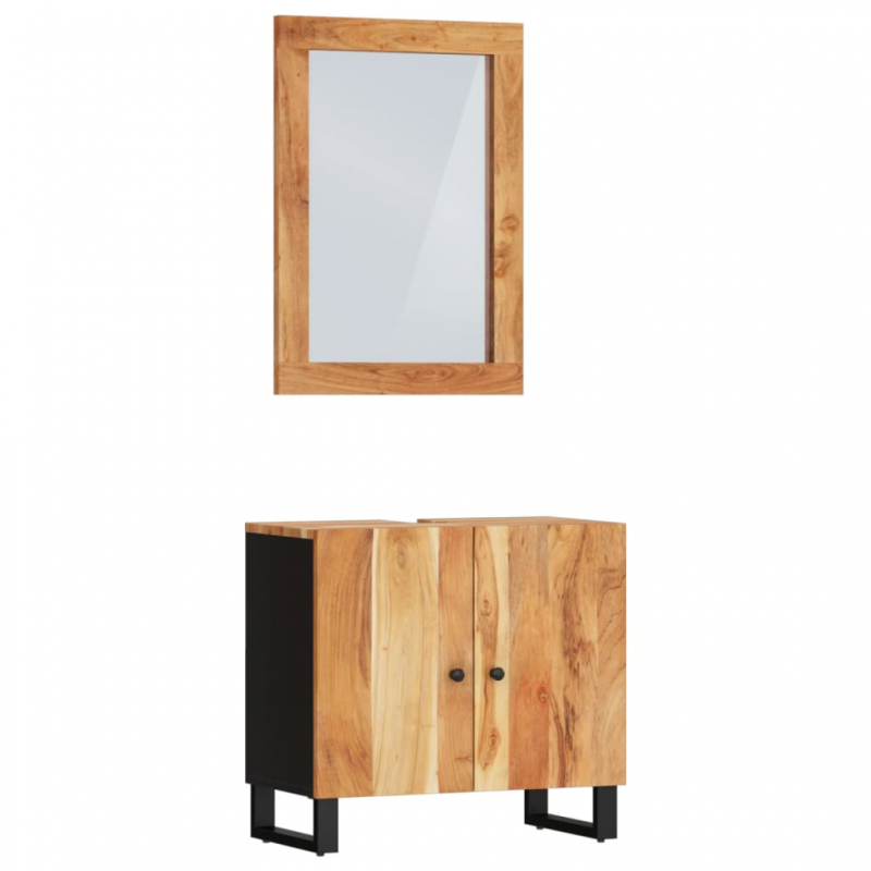 Dieses praktische Badmöbel-Set ist eine hervorragende Ergänzung für dein Badezimmer und verleiht ihm ein aufgeräumtes und eindrucksvolles Aussehen! Akazien-Massivholz: Der Schrank ist aus massivem Akazienholz in Kombination mit Holzwerkstoff gefertigt. Massives Akazienholz ist ein schönes Naturmaterial. Es ist ein tropisches Hartholz, das dicht, robust und langlebig ist.Ausreichend Stauraum: Der Badezimmerschrank bietet reichlich Stauraum für die Aufbewahrung von Gegenständen in deinem Badezimmer.Stabile Beine: Die Eisenbeine verleihen dem Badezimmerschrank Robustheit und Stabilität.Praktisches Design: Die Oberseite des Waschbeckenunterschranks ist ideal für die Unterbringung des Waschbeckens.Klares Spiegelbild: Der Glasspiegel bietet eine klare Spiegelung. So kannst du ein schönes und natürliches Spiegelbild genießen, wenn du vor dem Spiegel steht. Achtung:Um ein Umkippen zu vermeiden, sollte dieses Produkt mit der mitgelieferten Wandhalterung gesichert werden.Gut zu wissen:Das Waschbecken ist nicht im Lieferumfang enthalten.Schrauben und Dübel sind für die Befestigung an der Wand nicht im Lieferumfang enthalten. Wir empfehlen, speziell für deine Wände geeignete Schrauben und Dübel zu finden und zu verwenden. Im Zweifelsfall wende dich an einen Fachmann. Bitte lese und befolge jeden Schritt der Anweisungen.Jedes Stück ist ein Unikat, das in Farbe und Maserung variiert. Die Lieferung erfolgt in zufälliger Reihenfolge, wodurch die Exklusivität und Individualität deines Produkts gewährleistet wird.