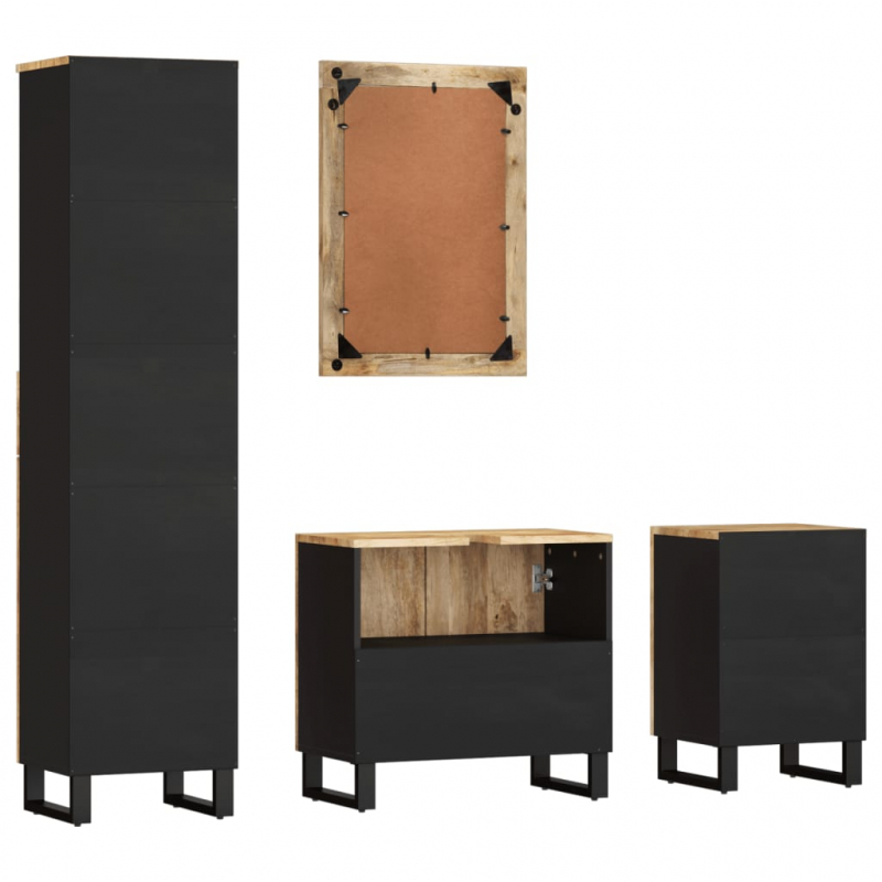 Dieses praktische Badmöbel-Set mit geräumigem Stauraum ist eine hervorragende Ergänzung für dein Badezimmer und verleiht ihm ein aufgeräumtes und eindrucksvolles Aussehen! Mango-Massivholz: Der Badschrank ist aus massivem Mangoholz in Kombination mit Holzwerkstoff gefertigt. Mango-Massivholz ist ein starkes, tropisches Hartholz, aus dem sich robuste Möbel herstellen lassen. Die schöne Maserung des Holzes macht jedes Möbelstück einzigartig.Ausreichend Stauraum: Der Badezimmerschrank bietet verschiedene Aufbewahrungsmöglichkeiten und geräumigen Platz für die Aufbewahrung von Gegenständen in deinem Badezimmer.Stabile Beine: Die Eisenbeine verleihen dem Badezimmerschrank Robustheit und Stabilität.Praktisches Design: Die Oberseite des Waschbeckenunterschranks ist ideal für die Unterbringung des Waschbeckens.Klares Spiegelbild: Der Glasspiegel bietet eine klare Spiegelung. So kannst du ein schönes und natürliches Spiegelbild genießen, wenn du vor dem Spiegel steht. Achtung:Um ein Umkippen zu vermeiden, sollte dieses Produkt mit der mitgelieferten Wandhalterung gesichert werden.Gut zu wissen:Das Waschbecken ist nicht im Lieferumfang enthalten.Schrauben und Dübel sind für die Befestigung an der Wand nicht im Lieferumfang enthalten. Wir empfehlen, speziell für deine Wände geeignete Schrauben und Dübel zu finden und zu verwenden. Im Zweifelsfall wende dich an einen Fachmann. Bitte lese und befolge jeden Schritt der Anweisungen.Jedes Stück ist ein Unikat, das in Farbe und Maserung variiert. Die Lieferung erfolgt in zufälliger Reihenfolge, wodurch die Exklusivität und Individualität deines Produkts gewährleistet wird.