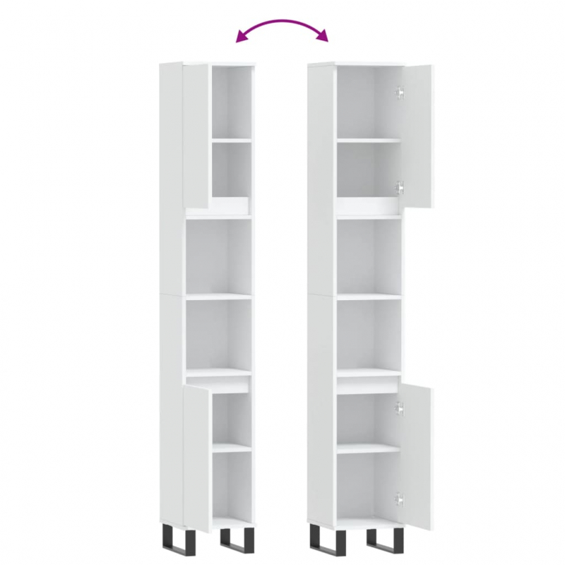 Dieser Badezimmerschrank ist eine großartige Bereicherung für dein Badezimmer und verleiht ihm ein ordentliches und auffälliges Aussehen! Langlebiges Material: Holzwerkstoff ist ein Material von außergewöhnlicher Qualität mit glatter Oberfläche, das sich durch Festigkeit, Stabilität und Feuchtigkeitsbeständigkeit auszeichnet.Viel Stauraum: Der Badezimmerschrank verfügt über 4 Fächer mit Türen und 2 offene Fächer, die verschiedene Aufbewahrungsmöglichkeiten und zusätzlichen Stauraum in deinem Badezimmer bieten.Flexibler Türeinbau: Du kannst die Türen je nach Bedarf auf der linken oder rechten Seite montieren.Füße aus Eisen: Die Eisenfüße verleihen deiner Einrichtung einen industriellen Stil und sorgen gleichzeitig für die Stabilität des Badschranks. Achtung:Um ein Umkippen zu vermeiden, sollte dieses Produkt mit der mitgelieferten Wandhalterung gesichert werden. Gut zu wissen:Schrauben und Dübel sind für die Befestigung an der Wand nicht im Lieferumfang enthalten. Wir empfehlen, speziell für deine Wände geeignete Schrauben und Dübel zu finden und zu verwenden. Im Zweifelsfall wende dich an einen Fachmann. Bitte lese und befolge jeden Schritt der Anweisungen.