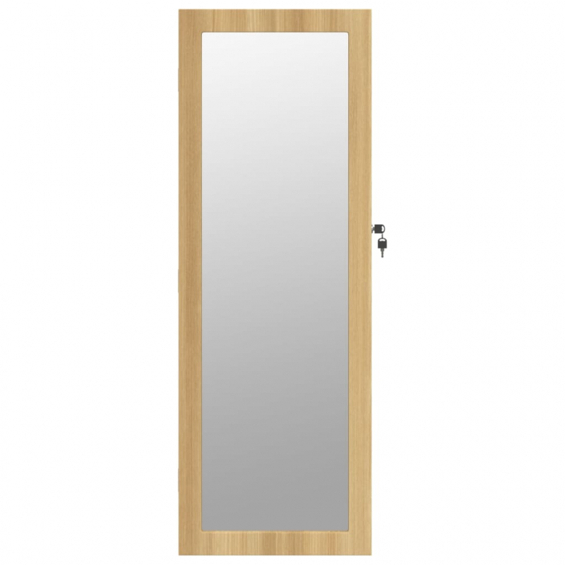 Bewahre deinen Schmuck und deine Parfums diskret und elegant auf in diesem stilvollen Spiegel-Schmuckschrank mit LED-Beleuchtung! Langlebiges Material: Holzwerkstoff ist ein Material von außergewöhnlicher Qualität mit glatter Oberfläche, das sich durch Festigkeit, Stabilität und Feuchtigkeitsbeständigkeit auszeichnet. Aus Holzwerkstoff gefertigt, lässt sich der Schmuckschrank mit einem feuchten Tuch leicht reinigen.Reichlich Stauraum: Der Spiegelschrank verfügt über 2 Schubladen und zahlreiche Haken, Bügel und Ablagen, um deinen Schmuck übersichtlich und griffbereit aufzubewahren.Praktischer Spiegel: Mit seinem großen Spiegel ist dieser Schmuck-Organizer ideal, um sich vorzubereiten und zu schminken.Sorgfältiger Schutz: Der Schrank zur Schmuckaufbewahrung hat eine abschließbare Tür und wird mit 2 Schlüsseln geliefert, um die Sicherheit deiner Sachen zu gewährleisten. Der weiche Stoffbezug im Inneren verleiht nicht nur Eleganz, sondern schützt auch deine geliebte Wertsachen vor Kratzern.Praktische LED-Beleuchtung: Die LED-Beleuchtung an der oberen Innenseite schaltet sich beim Öffnen der Tür automatisch ein und erleichtert dir das Auffinden deiner Schmucksachen.Platzsparendes Design: Hänge das Spiegel-Schmuckkästchen mit den mitgelieferten Haken über die Tür oder montiere es an der Wand, um Platz zu sparen. Gut zu wissen:Schrauben für die Wandmontage sind im Lieferumfang enthalten.3 AA-Batterien sind erforderlich (nicht im Lieferumfang enthalten).