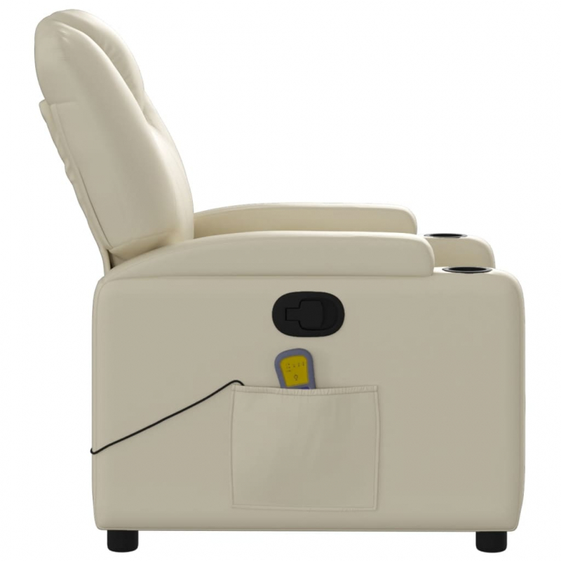 Lehne dich zurück und entspanne dich in diesem äußerst bequemen Massagesessel! Manuelle Liegefunktion: Dieser Ruhesessel lässt sich mittels des seitlichen Griffs verstellen. So kannst du das Fußteil und die Rückenlehne manuell in jede beliebige Position bringen, um die komfortabelste Position zu genießen. Die Rückenlehne lässt sich max. 135 Grad nach hinten verstellen. Durch einfaches Ziehen am Griff wird sie schnell in die ursprüngliche Position zurückgestellt.Vibrationsfunktion: Mit den 6 Massagepunkten kann man eine gezielte Massage genießen. Außerdem ermöglicht die mitgelieferte Handsteuerung die Auswahl verschiedener Massageprogramme. Die Massagefunktion wird über den USB-Anschluss mit Strom betrieben, aber das zugelassene 5V-USB-Netzteil ist nicht im Lieferumfang enthalten.Bequemes Sitzerlebnis: Die dick gepolsterte Sitzfläche, die Rückenlehne und die breiten, mit Kunstleder bezogenen Armlehnen sorgen für ein behagliches und angenehmes Sitzgefühl. Kunstleder ist ein äußerst langlebiges Material. Es ist schmutzabweisend und lässt sich mit einem feuchten Tuch einfach reinigen. Durch die glatte Oberfläche weist es die luxuriöse Schönheit von Echtleder auf.Praktische Getränkehalter und Seitentasche: Dieser Sessel verfügt über zwei praktische Getränkehalter und eine Seitentasche, in der du deine Fernbedienung oder andere wichtige Sachen griffbereit aufbewahren kannst.Solider und stabiler Rahmen: Der Rahmen aus Holz und Metall sorgt für eine solide Struktur und hohe Stabilität. Dieser TV-Sessel ist bequem und langlebig.