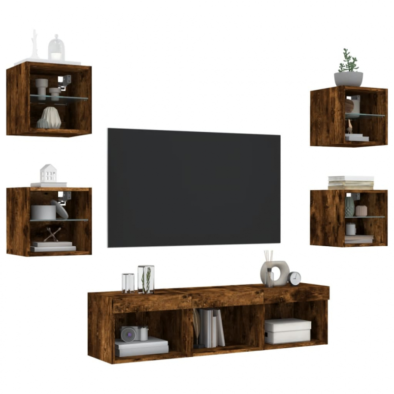 Diese TV-Wandschränke bieten eine perfekte Lösung, um zusätzlichen Stauraum in deinem Wohnraum zu schaffen und für Ordnung zu sorgen. Robustes Material: Holzwerkstoff ist ein Material von außergewöhnlicher Qualität mit glatter Oberfläche, das sich durch Festigkeit, Stabilität und Feuchtigkeitsbeständigkeit auszeichnet.RGB-LED-Leuchten: Die Wohnwand ist mit lebendigen RGB-LED-Leuchten ausgestattet. Mit verschiedenen anpassbaren Menüs kannst du die Farbe der Lichter mühelos wechseln und sie sogar auf automatische Anpassung einstellen. Diese LED-Leuchten unterstreichen nicht nur den modernen Look des TV-Wandschranks, sondern tragen auch zu seiner trendigen Optik bei.Wandmontage: Der TV-Schrank lässt sich an der Wand montieren, um zusätzlichen Stauraum zu schaffen. Auf diese Weise kannst du deine Bodenfläche maximieren und für Ordnung im Raum sorgen.Reichlich Stauraum: Das TV-Wandschrank-Set bietet reichlich Platz, um Bücher, DVDs, Zeitschriften, Medien und andere Alltagsgegenstände übersichtlich und griffbereit zu verstauen.Vielseitiges Design: Du kannst den Schrank als TV-Schrank verwenden oder ihn im Arbeitszimmer an der Wand montieren, um Utensilien oder andere Gegenstände bequem aufzubewahren. Zudem verwandelt er eine leere Wand sofort in ein Design-Element. Gut zu wissen:Schrauben und Dübel für die Innenseite der Wand sind nicht enthalten. Wir empfehlen dir, Schrauben und Dübel zu finden und zu verwenden, die speziell für deine Wände geeignet sind. Wenn du dir nicht sicher bist, kannst du dich an einen Fachmann wenden. Bitte lies und befolge jeden Schritt in der Anleitung.Das Produkt verfügt über einen USB-Anschluss, für den eine zertifizierte 5V-USB-Stromquelle erforderlich ist (nicht im Lieferumfang enthalten).