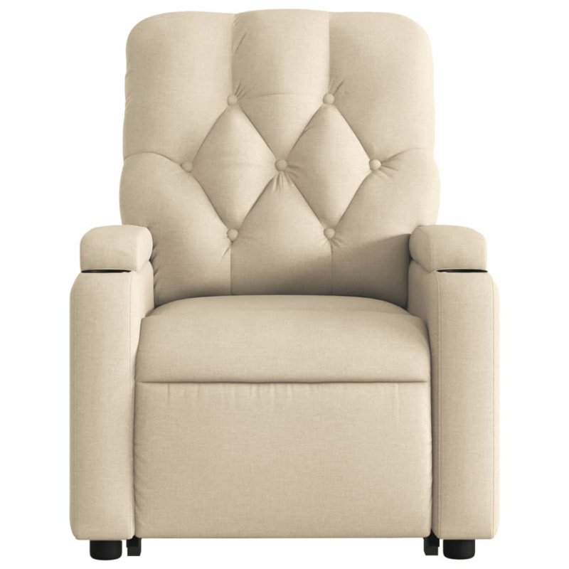 Lehne dich zurück und entspanne dich in diesem äußerst bequemen Massagesessel mit Aufstehhilfe! Elektrische Aufstehhilfe: Dieser Relaxsessel ist mit einem Elektromotor zum Anheben ausgestattet. Dank der Aufstehhilfe, die den gesamten Sessel nach oben bringt, kannst du ganz einfach auf Knopfdruck aufstehen, ohne deinen Rücken und deine Knie zu belasten.Manuelle Liegefunktion: Dieser Ruhesessel lässt sich mittels des Griffs an der rechten Seite verstellen. So kannst du das Fußteil und die Rückenlehne manuell in jede beliebige Position bringen, um höchsten Komfort zu genießen. Die Rückenlehne lässt sich max. 135 Grad nach hinten verstellen. Durch einfaches Ziehen lässt sie sich schnell wieder in die ursprüngliche Position bringen.Vibrationsfunktion: Dank der 6 Massagepunkte genießt du eine gezielte Massage. Zudem lassen sich verschiedene Massageprogramme über die mitgelieferte Handsteuerung auswählen. Die Massagefunktion wird über den USB-Anschluss betrieben, der eine zertifizierte 5-V-USB-Stromquelle erfordert (nicht im Lieferumfang enthalten).Bequemes Sitzerlebnis: Die dick gepolsterte Sitzfläche, die Rückenlehne und die breiten Armlehnen sorgen für ein behagliches und wohliges Sitzgefühl. Der Bezug aus Stoff weist eine schlichte und saubere Optik auf und ist auch atmungsaktiv und langlebig.Praktische Getränkehalter und Seitentasche: Dieser Sessel verfügt über zwei praktische Becherhalter und eine Seitentasche, in der du wichtige Sachen griffbereit aufbewahren kannst.Solider und stabiler Rahmen: Der Rahmen aus Holz und Metall sorgt für eine solide Struktur und hohe Stabilität. Dieser TV-Sessel ist bequem und langlebig.