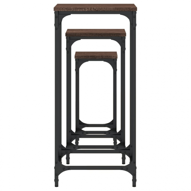 Diese drei Satztische sind eine clevere Lösung für kleinere Wohnräume oder Zimmer mit begrenztem Platzangebot. Mit seinem industriellen Design verleiht dieses Beistelltisch-Set deinem Wohnzimmer, Schlafzimmer oder Büro eine schicke Note. Langlebiges Material: Der Holzwerkstoff ist von außergewöhnlicher Qualität mit glatter Oberfläche und zeichnet sich außerdem durch Festigkeit, Stabilität und Widerstandsfähigkeit gegen Feuchtigkeit aus. Diese Nisttische aus Holzwerkstoff sind leicht zu reinigen.Verschachtelbar: Die Satztische haben verschiedene Größen, um deinen unterschiedlichen Bedürfnissen gerecht zu werden. Der kleinere Tisch kann in dem größeren aufbewahrt werden; so kannst du mehr Platz schaffen.Stabile Platte: Die robuste Tischplatte des Nesting-Ständers ist ideal, um deine Getränke oder andere Dinge, die du brauchst, griffbereit zu haben.Vielseitige Funktion: Die stapelbaren Tische sind vielseitig verwendbar! Einer von kann als Nachttisch im Schlafzimmer, der andere als Couchtisch im Wohnzimmer und der dritte als Ablagetisch im Büro verwendet werden.Metallrahmen: Der Metallrahmen verleiht deiner Einrichtung einen industriellen Stil und sorgt gleichzeitig für Haltbarkeit und Stabilität. Achtung:Um ein Umkippen zu vermeiden, sollte dieses Produkt mit der mitgelieferten Wandhalterung gesichert werden.