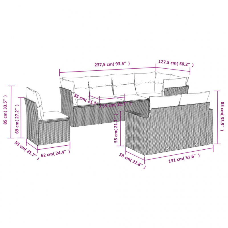 8-tlg. Garten-Sofagarnitur mit Kissen Schwarz Poly Rattan