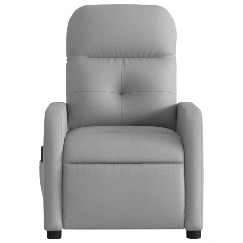 Lehne dich zurück und entspanne dich in diesem äußerst bequemen Massagesessel! Elektrische Liegefunktion: Dieser Relaxsessel ist mit einem Elektromotor ausgestattet, der Fußstütze und Rückenlehne durch einfaches Drücken des seitlichen Knopfes automatisch in jede gewünschte Position bringt. Diese Funktion ermöglicht eine maximale Neigung von 135 Grad. Darüber hinaus lässt sich die Rückenlehne auf Knopfdruck automatisch in die ursprünglichen Position zurückbringen.Vibrationsfunktion: Dank der 6 Massagepunkte genießt du eine gezielte Massage. Zudem lassen sich verschiedene Massageprogramme über die mitgelieferte Handsteuerung auswählen. Die Massagefunktion wird über den USB-Anschluss betrieben, der eine zertifizierte 5-V-USB-Stromquelle erfordert (nicht im Lieferumfang enthalten).Bequemes Sitzerlebnis: Die dick gepolsterte Sitzfläche, die Rückenlehne und die breiten Armlehnen sorgen für ein behagliches und wohliges Sitzgefühl. Der Bezug aus Stoff weist eine schlichte und saubere Optik auf und ist auch atmungsaktiv und langlebig.Praktische Seitentasche: Dieser Sessel verfügt über eine Seitentasche, in der du deine Fernbedienung oder andere wichtige Sachen griffbereit aufbewahren kannst.Solider und stabiler Rahmen: Der Rahmen aus Holz und Metall sorgt für eine solide Struktur und hohe Stabilität. Dieser TV-Sessel ist bequem und langlebig.