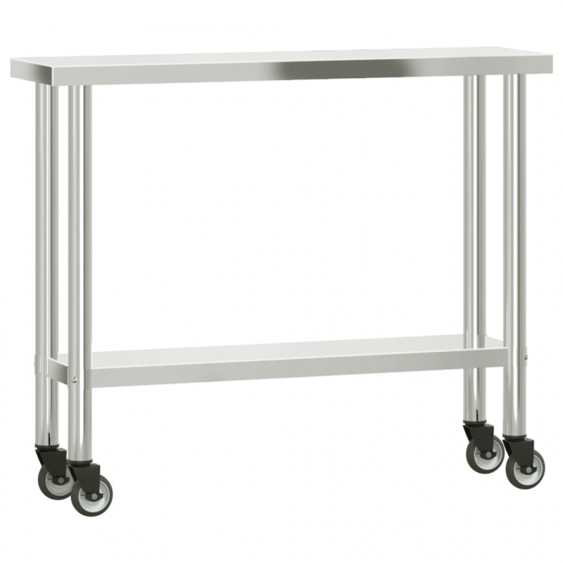 Dieser Küchentisch eignet sich perfekt für die Zubereitung und Lagerung von Lebensmitteln und lässt sich in Küchen, Bars, Restaurants, Schulen sowie anderen gewerblichen Einrichtungen einsetzen. Langlebige und stabile Konstruktion: Der Arbeitstisch ist aus Edelstahl gefertigt, der korrosions- sowie rostbeständig ist, und ist dadurch auf eine jahrelange Lebensdauer ausgelegt. Die glatte Oberfläche lässt sich leicht reinigen und pflegen und gewährleistet einen hygienischen Bereich für die Lebensmittelzubereitung.Großzügiger Arbeitsplatz: Der Vorbereitungstisch aus Edelstahl verfügt über eine untere Ablage und ein Überregal mit 2 Böden, die zusätzlichen Stauraum schaffen und reichlich Platz für eine Mikrowelle, Küchenutensilien oder andere Geräte bieten.Flexibel: Der Arbeitstisch für die Lebensmittelzubereitung verfügt über 4 Räder, sodass du ihn einfach und bequem dorthin rollen kannst, wo du ihn benötigst. Zudem sind 2 Räder für zusätzliche Kontrolle und Sicherheit arretierbar. Achtung:Um ein Umkippen zu vermeiden, sollte dieses Produkt mit der mitgelieferten Wandhalterung gesichert werden.