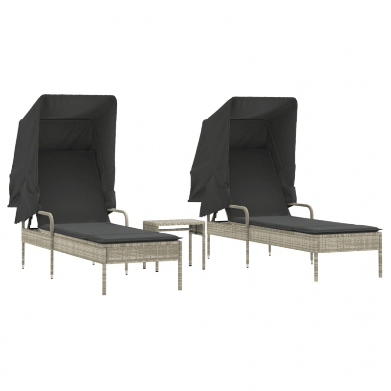 Sonnenliegen 2 Stk. mit Dach und Tisch Hellgrau Poly Rattan