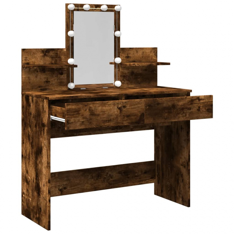 Dieser Schminktisch ist eine großartige Ergänzung zu deinem Schlafzimmer und bietet auch Platz zur griffbereiten Aufbewahrung deiner Kosmetika! Starkes und langlebiges Material: Holzwerkstoff ist ein langlebiges und robustes Material mit einer glatten Oberfläche, das gegen Feuchtigkeit, Verformung und Rissbildung beständig ist, wodurch es eine zuverlässigen Wahl für die Herstellung von Möbeln ist.Viel Stauraum: Der Schminktisch mit 2 Schubladen und 2 Ablagen bietet viel Platz, um verschiedene Alltagssachen gut organisiert und in Reichweite aufzubewahren.Allzweckspiegel: Der schöne Spiegel bietet eine klare Sicht beim Auftragen von Make-up und verleiht dem Schminktisch eine elegante Note.LED-Leuchten: Der Schminktisch verfügt auch über LED-Leuchten mit USB, die einfach von Warmweiß auf Kaltweiß umgeschaltet werden können. Dabei beleuchten die LED-Lampen rund um den Spiegel dein Gesicht optimal. Achtung:Um ein Umkippen zu vermeiden, sollte dieses Produkt mit der mitgelieferten Wandhalterung gesichert werden.