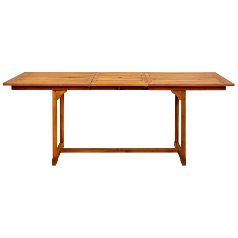 Mit diesem Garten-Esstisch aus Holz bringen Sie einen Hauch von rustikalem Charme in Ihren Outdoor-Wohnbereich! Der Gartentisch besteht aus massivem Akazienholz, einem tropischen Hartholz, das witterungsbeständig und sehr langlebig ist. Dank der mit Öl behandelten Oberfläche lässt er sich außerdem leicht mit einem feuchten Tuch reinigen. Dank seines speziellen Designs kann dieser Gartentisch erweitert werden, wenn zusätzlicher Platz benötigt wird. Hinweis: Um die Lebensdauer Ihrer Gartenmöbel zu verlängern, empfehlen wir Ihnen, diese regelmäßig zu reinigen und bei Nichtgebrauch im Freien abzudecken.Reinigung: Verwenden Sie eine milde Seifenlösung.Lagerung: Wenn möglich, an einem kühlen, trockenen Ort im Innenbereich lagern. Wenn das Produkt im Freien gelagert wird, schützen Sie es mit einer wasserdichten Abdeckung. Wischen und trocknen Sie das überschüssige Wasser oder den Schnee nach Regen oder Schneefall von der ebenen Fläche. Sorgen Sie für eine ausreichende Luftzirkulation, um feuchtigkeitsbedingte Schäden zu vermeiden.