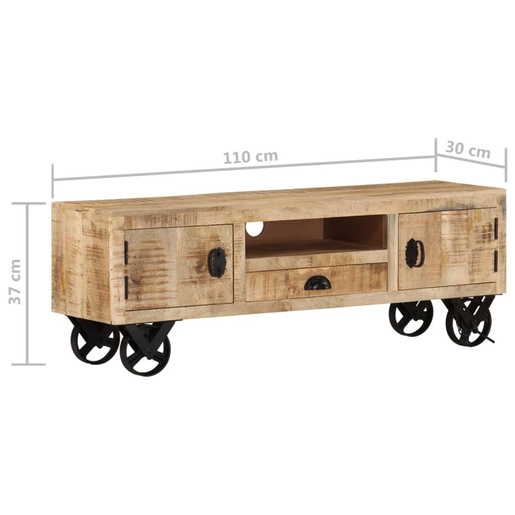 Dieses TV-Möbel aus Holz im Retro-Stil wird der Mittelpunkt deines Wohnzimmers oder Heimkinos sein. Der TV-Schrank besteht aus rauem Mangoholz, einem tropischen Hartholz, das sowohl äußerst belastbar als auch verschleißfest ist, was den Schrank stabil und langlebig macht. Die Handwerkskunst und die schöne Holzmaserung machen jedes Möbelstück zu einem Unikat. Mit zwei Türen, einer Schublade und einem Fach ausgestattet, bietet der TV-Tisch reichlich Stauraum, um DVD-Player, Spielkonsole, Streaming-Geräte und Medienträger ganz ordentlich aufzubewahren. Die große Oberplatte stellt den perfekten Platz für Ihren Fernseher, Router, Multimedia-Geräte sowie Dekoartikel zur Verfügung. Darüber hinaus lässt sich das Lowboard dank der 4 Räder ganz einfach umher verschieben. Wichtiger Hinweis: Maserung und Farben variieren von Stück zu Stück und machen jedes Möbelstück zu einem Unikat. Die Lieferung erfolgt nach dem Zufallsprinzip und gewährleistet so die Exklusivität und Individualität deines Produkts.