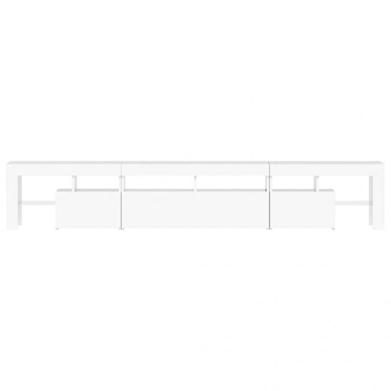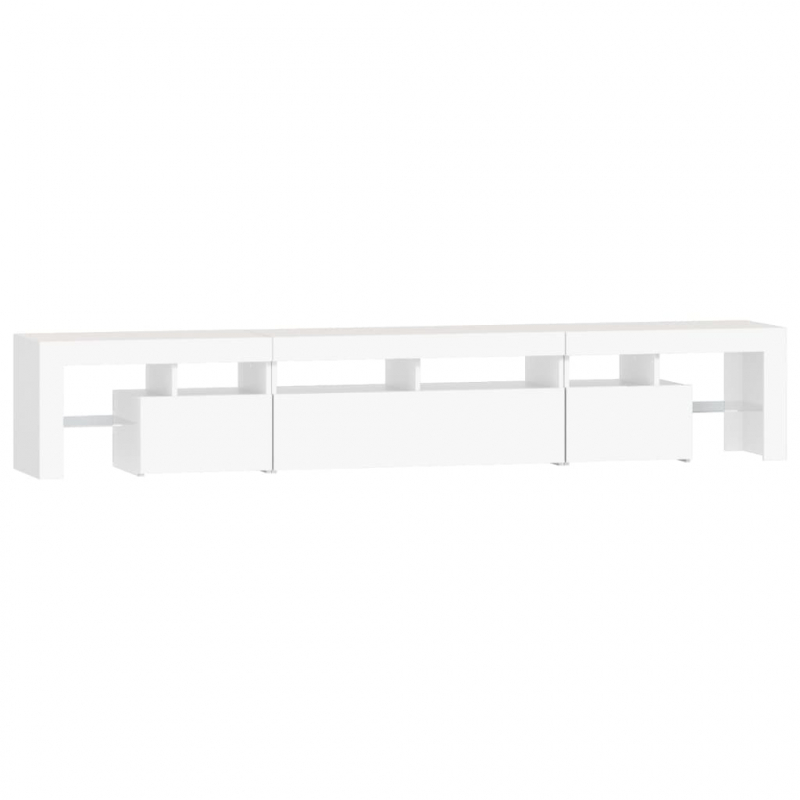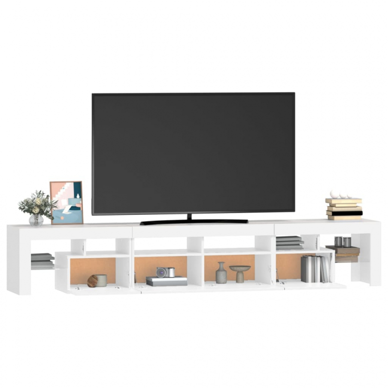 Mit seinem trendigen und zugleich praktischen Design wird dieser TV-Schrank mit LED-Leuchten definitiv zum Blickfang in Ihrem Zimmer. Starkes Material: Holzwerkstoff ist ein Material von außergewöhnlicher Qualität mit glatter Oberfläche, das sich durch Festigkeit, Stabilität und Feuchtigkeitsbeständigkeit auszeichnet. Mehrfarbige LED-Leuchten: Dieser TV-Ständer ist mit RGB-LED-Leuchten ausgestattet, die über verschiedene Menüs verfügen, um die Farbe der Leuchten zu wechseln und automatische Farbeinstellungen vorzunehmen. Die LED-Leuchten unterstreichen den modernen Look und tragen zum trendigen Gefühl bei.Reichlich Stauraum: Der TV-Schrank bietet reichlich Stauraum, um deine Zeitschriften, Bücher, Fernbedienungen und andere Kleinigkeiten gut organisiert und in Reichweite aufzubewahren.Präsentation: Die robuste Oberplatte des Medienschranks bietet den idealen Platz, um Dekoartikel, Fotorahmen oder Topfpflanzen zur Schau zu stellen. Hinweis:Das Produkt verfügt über einen USB-Anschluss, aber die zertifizierte 5-V-USB-Stromquelle ist nicht im Lieferumfang enthalten.Jedes Produkt wird mit einer Montageanleitung in der Verpackung für eine einfache Montage geliefert.