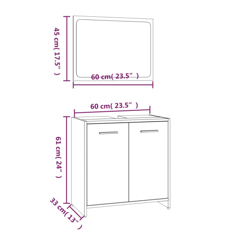 Dieses stilvolle Badmöbel-Set mit viel Stauraum ist eine ausgezeichnete Ergänzung für Ihr Badezimmer, denn es verleiht ihm ein aufgeräumtes und auffälliges Erscheinungsbild! Langlebiges Material: Holzwerkstoff ist ein Material von außergewöhnlicher Qualität mit glatter Oberfläche, das sich durch Festigkeit, Stabilität und Feuchtigkeitsbeständigkeit auszeichnet.Viel Stauraum: Dieser Badezimmerschrank verfügt über 1 Fach und 2 Türen und bietet viel Stauraum für die Aufbewahrung verschiedener Sachen in deinem Badezimmer. Jede Tür ist mit einem Griff versehen, der das Öffnen und Schließen erleichtert.Stilvolles Design: Die klaren Linien und das schlanke Design fügen sich perfekt in dein Badezimmer ein. Der Spiegel verleiht deiner Einrichtung eine hervorragende Optik.Einfache Reinigung: Das Badmöbel-Set lässt sich leicht mit einem feuchten Tuch reinigen. Achtung:Um das Umkippen zu verhindern, muss dieses Produkt mit der mitgelieferten Wandhalterung gesichert werden. Hinweis:Schrauben und Dübel für die Wandbefestigung sind nicht enthalten. Suchen und verwenden Sie die für Ihre Wände geeigneten Schrauben und Dübel. Wenn Sie unsicher sind, suchen Sie professionelle Hilfe. Lesen und befolgen Sie jeden Schritt der Anleitung sorgfältig.Jedes Produkt wird mit einer Montageanleitung in der Verpackung für eine einfache Montage geliefert.