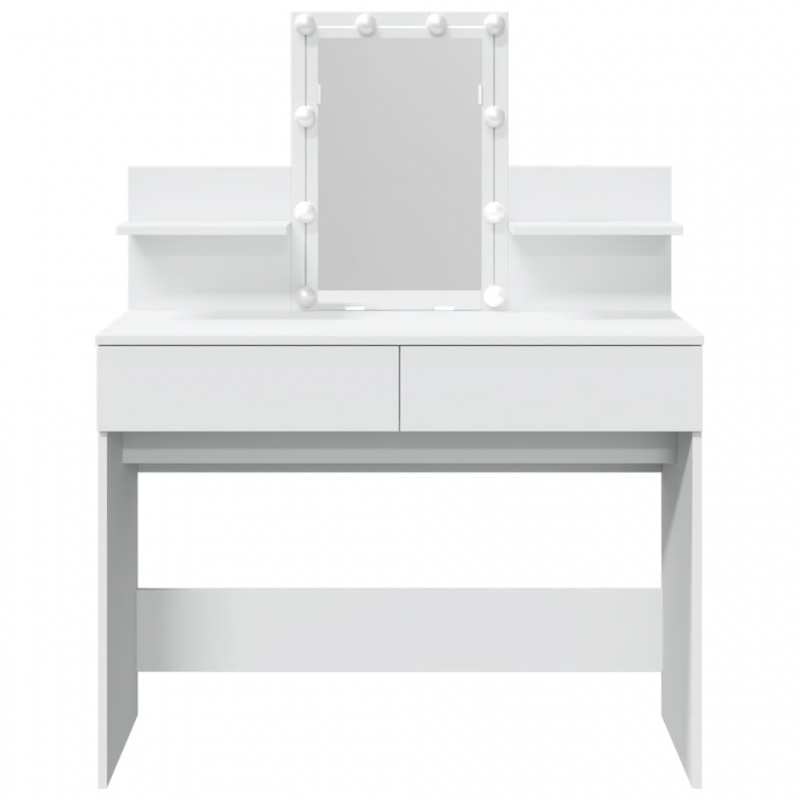 Dieser Schminktisch ist eine großartige Ergänzung zu deinem Schlafzimmer und bietet auch Platz zur griffbereiten Aufbewahrung deiner Kosmetika! Starkes und langlebiges Material: Holzwerkstoff ist ein langlebiges und robustes Material mit einer glatten Oberfläche, das gegen Feuchtigkeit, Verformung und Rissbildung beständig ist, wodurch es eine zuverlässigen Wahl für die Herstellung von Möbeln ist.Viel Stauraum: Der Schminktisch mit 2 Schubladen und 2 Ablagen bietet viel Platz, um verschiedene Alltagssachen gut organisiert und in Reichweite aufzubewahren.Allzweckspiegel: Der schöne Spiegel bietet eine klare Sicht beim Auftragen von Make-up und verleiht dem Schminktisch eine elegante Note.LED-Leuchten: Der Schminktisch verfügt auch über LED-Leuchten mit USB, die einfach von Warmweiß auf Kaltweiß umgeschaltet werden können. Dabei beleuchten die LED-Lampen rund um den Spiegel dein Gesicht optimal. Achtung:Um ein Umkippen zu vermeiden, sollte dieses Produkt mit der mitgelieferten Wandhalterung gesichert werden.