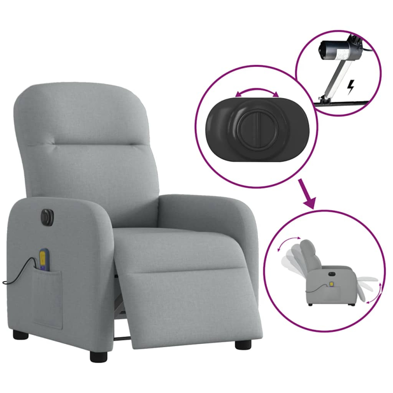 Lehne dich zurück und entspanne dich in diesem äußerst bequemen Massagesessel! Elektrische Liegefunktion: Dieser Relaxsessel ist mit einem Elektromotor ausgestattet, der Fußstütze und Rückenlehne durch einfaches Drücken des seitlichen Knopfes automatisch in jede gewünschte Position bringt. Diese Funktion ermöglicht eine maximale Neigung von 135 Grad. Darüber hinaus lässt sich die Rückenlehne auf Knopfdruck automatisch in die ursprünglichen Position zurückbringen.Vibrationsfunktion: Dank der 6 Massagepunkte genießt du eine gezielte Massage. Zudem lassen sich verschiedene Massageprogramme über die mitgelieferte Handsteuerung auswählen. Die Massagefunktion wird über den USB-Anschluss betrieben, der eine zertifizierte 5-V-USB-Stromquelle erfordert (nicht im Lieferumfang enthalten).Bequemes Sitzerlebnis: Die dick gepolsterte Sitzfläche, die Rückenlehne und die breiten Armlehnen sorgen für ein behagliches und wohliges Sitzgefühl. Der Bezug aus Stoff weist eine schlichte und saubere Optik auf und ist auch atmungsaktiv und langlebig.Praktische Seitentasche: Dieser Sessel verfügt über eine Seitentasche, in der du deine Fernbedienung oder andere wichtige Sachen griffbereit aufbewahren kannst.Solider und stabiler Rahmen: Der Rahmen aus Holz und Metall sorgt für eine solide Struktur und hohe Stabilität. Dieser TV-Sessel ist bequem und langlebig.