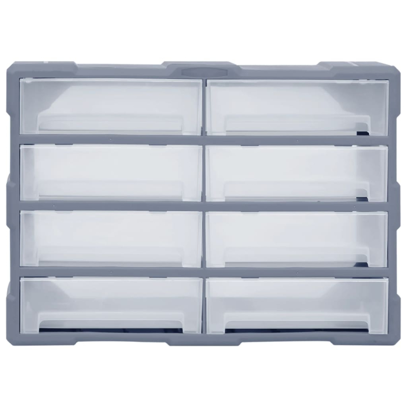 Dieser Multi-Schubladen-Organizer mit insgesamt 8 großen Schubladen ist für die übersichtliche Aufbewahrung einer Vielzahl von Gegenständen konzipiert. Er kann auch als Näh- oder Nagelkasten verwendet werden. Diese Aufbewahrungseinheit enthält 8 große Schubladen, um mehr Stauraum zu bieten. Es hält Ihre Handwerkzeuge und Zubehörteile wie Befestigungselemente organisiert und in Reichweite. Die Lagerboxen bestehen aus schlagfestem Kunststoff, der sowohl langlebig als auch robust ist. Die Schubladen bestehen aus durchsichtigem Kunststoff, damit Sie deren Inhalt schnell identifizieren können. Die Sichtlagerboxen sind ideal für die Aufbewahrung von Schraubenmuttern, Bolzen, Schrauben, Nägeln, Befestigungselemente und Komponenten. Dieser Artikel kann an der Wand montiert und einzeln als Werkzeug-Organizer verwendet werden.