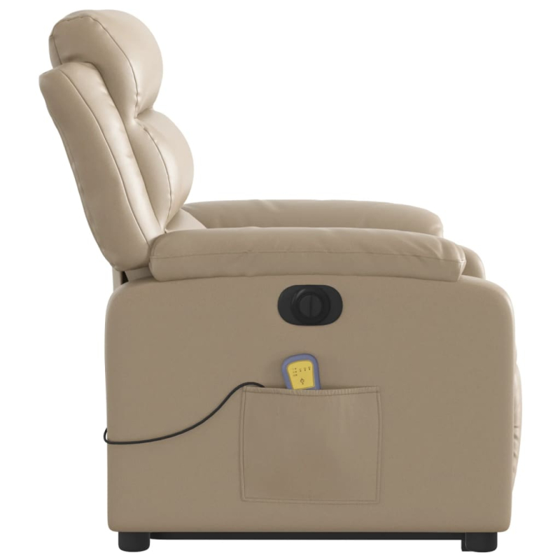 Lehne dich zurück und entspanne dich in diesem äußerst bequemen elektrischen Massagesessel mit Aufstehhilfe! Elektrische Aufstehhilfe: Dieser Relaxsessel ist mit einem Elektromotor zum Anheben ausgestattet. Dank der Aufstehhilfe, die den gesamten Sessel nach oben bringt, kannst du ganz einfach auf Knopfdruck aufstehen, ohne deinen Rücken und deine Knie zu belasten.Elektrische Liegefunktion: Dieser Relaxsessel ist mit einem Elektromotor ausgestattet, der Fußstütze und Rückenlehne durch einfaches Drücken des seitlichen Knopfes automatisch in jede gewünschte Position bringt. Diese Funktion ermöglicht eine maximale Neigung von 135 Grad. Darüber hinaus lässt sich die Rückenlehne auf Knopfdruck automatisch in die ursprünglichen Position zurückbringen.Vibrationsfunktion: Dank der 6 Massagepunkte genießt du eine gezielte Massage. Zudem lassen sich verschiedene Massageprogramme über die mitgelieferte Handsteuerung auswählen. Die Massagefunktion wird über den USB-Anschluss betrieben, der eine zertifizierte 5-V-USB-Stromquelle erfordert (nicht im Lieferumfang enthalten).Bequemes Sitzerlebnis: Der dick gepolsterte Sitz, die Rückenlehne und die breiten, mit Kunstleder bezogenen Armlehnen sorgen für ein behagliches und angenehmes Sitzgefühl. Künstliches Leder ist ein äußerst langlebiges Material. Es ist schmutzabweisend und lässt sich mit einem feuchten Tuch einfach reinigen. Durch die glatte Oberfläche weist es die luxuriöse Schönheit von Echtleder auf.Praktische Seitentasche: Dieser Sessel verfügt über eine Seitentasche, in der du deine Fernbedienung oder andere wichtige Sachen griffbereit aufbewahren kannst.Solider und stabiler Rahmen: Der Rahmen aus Holz und Metall sorgt für eine solide Struktur und hohe Stabilität. Dieser TV-Sessel ist bequem und langlebig.