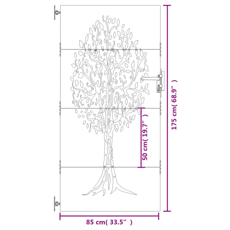 Dieses Gartentor stellt eine perfekte Kombination aus Stärke und Eleganz dar und bietet daher einen idealen Eingangspunkt am Zaun um den Garten oder die Terrasse. Robustes Material: Das Metalltor ist aus Cortenstahl gefertigt. Cortenstahl ist ein wetterfester Stahl, der auf seiner Oberfläche eine rostige Schutzschicht gegen Korrosion bildet, sobald er der Witterung ausgesetzt ist. Du brauchst ihn also nicht zu streichen. Dadurch kannst du Wartungs- und Reparaturkosten einsparen. Das markante Farbe des Cortenstahls ist sicherlich ein Blickfang. Schließlich ist wetterfester Stahl außerordentlich langlebig und hält dem Test der Zeit stand. Lasergeschnittenes Design: Das Zauntor verfügt über ein wunderschönes lasergeschnittenes Design, das deinem Zuhause einen einzigartigen Charme verleiht.Abschließbar: Das Stahltor für zusätzliche Sicherheit ausgestattet abschließbar. Gut zu wissen:Dieses Produkt sollte zusammengebaut werden.Dieses Produkt ist noch nicht verrostet und weist beim Empfang eine normale Metallfarbe auf. Rost wird sich im Laufe der Zeit bilden. Du kannst den Rostprozess beschleunigen, indem du es mit Seifenwasser und Salzwasser besprühst. Um deine Kleidung fleckenfrei zu halten, vermeide den Kontakt mit der sich bildenden Rostschicht.