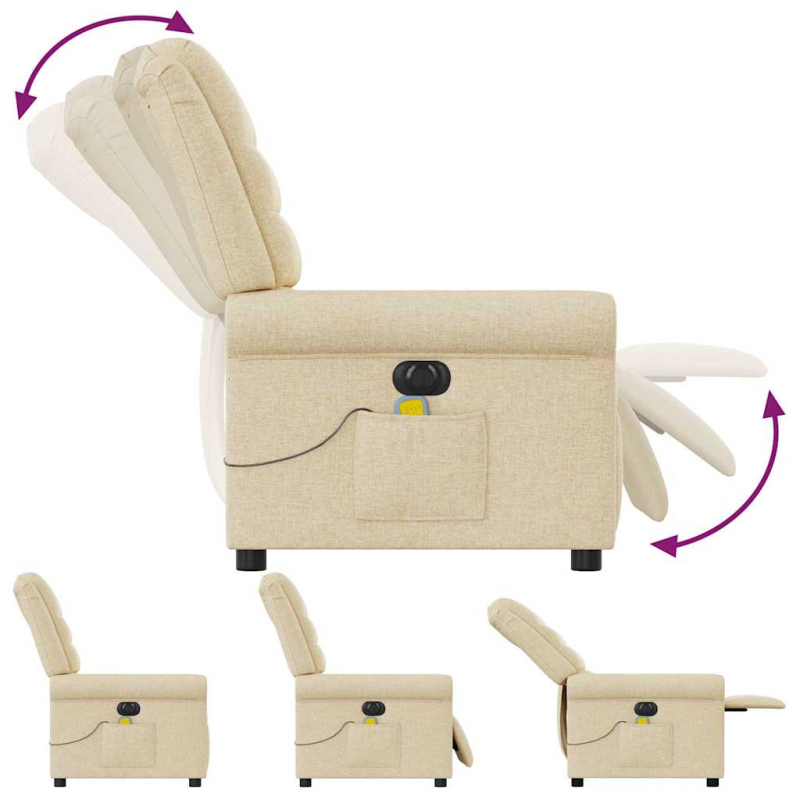 Lehne dich zurück und entspanne dich in diesem äußerst bequemen Massagesessel! Elektrische Liegefunktion: Dieser Relaxsessel ist mit einem Elektromotor ausgestattet, der Fußstütze und Rückenlehne durch einfaches Drücken des seitlichen Knopfes automatisch in jede gewünschte Position bringt. Diese Funktion ermöglicht eine maximale Neigung von 135 Grad. Darüber hinaus lässt sich die Rückenlehne auf Knopfdruck automatisch in die ursprünglichen Position zurückbringen.Vibrationsfunktion: Dank der 6 Massagepunkte genießt du eine gezielte Massage. Zudem lassen sich verschiedene Massageprogramme über die mitgelieferte Handsteuerung auswählen. Die Massagefunktion wird über den USB-Anschluss betrieben, der eine zertifizierte 5-V-USB-Stromquelle erfordert (nicht im Lieferumfang enthalten).Bequemes Sitzerlebnis: Die dick gepolsterte Sitzfläche, die Rückenlehne und die breiten Armlehnen sorgen für ein behagliches und wohliges Sitzgefühl. Der Bezug aus Stoff weist eine schlichte und saubere Optik auf und ist auch atmungsaktiv und langlebig.Praktische Seitentasche: Dieser Sessel verfügt über eine Seitentasche, in der du deine Fernbedienung oder andere wichtige Sachen griffbereit aufbewahren kannst.Solider und stabiler Rahmen: Der Rahmen aus Holz und Metall sorgt für eine solide Struktur und hohe Stabilität. Dieser TV-Sessel ist bequem und langlebig.