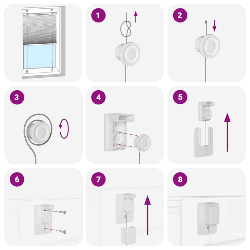 WARNUNG!Strangulationsgefahr für Kinder durch Schlaufen in Zugschnüren, Ketten, Bändern und der inneren Schnur, die dieses Produkt lenken!. Um Strangulierung und ein Verheddern zu vermeiden, halten Sie die Schnüre außerhalb der Reichweite von Kleinkindern. Schnüre können sich um den Hals eines Kindes wickeln. Betten, Babybett und Möbel in einer sicheren Entfernung von den Schnüren der Fensterrollos aufstellen. Binden Sie keine Kabel zusammen. Achten Sie darauf, dass sich die Schnüre nicht verdrehen und eine Schlaufe bilden. WARNUNG!Kinder können stranguliert werden, wenn dieses Sicherheitsgerät nicht montiert und eingestellt wurde. Lesen Sie die Bedienungsanleitung sorgfältig und bauen Sie das Gerät dementsprechend auf. GPSR