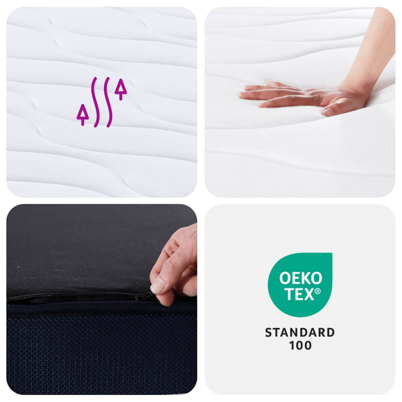 Diese Taschenfederkernmatratze wurde entwickelt, um ein angenehmes Gefühl und ein komfortables Schlaferlebnis zu gewährleisten. Haltbarkeit und Langlebigkeit: Der Stoff zeichnet sich durch einen schlichten und sauberen Look aus und ist gleichzeitig atmungsaktiv, hautfreundlich und langlebig. Individuelle Unterstützung: Jede gewebeummantelte Spiralfeder reagiert auf die Druckpunkte: sie stützt gezielt und verteilt den Druck auf die Wirbelsäule gleichmäßig. Druckentlastung: Die Taschenfederkernmatratze verfügt über 7 Liegezonen, die effektiv Druck entlasten und alle Körperbereiche wie Füße, Knie, Hüfte, Taille, Rücken, Schultern und Kopf optimal unterstützen. Erhöhter Komfort: Die Federkernmatratze besteht aus mehreren Schichten, darunter eine Schaumstoffschicht, eine Isolierschicht und eine Federschicht. Diese Kombination bietet ein weiches bis mittleres Liegegefühl und einen hohen Liegekomfort in allen Schlafpositionen. Darüber hinaus absorbiert die Matratze effektiv Geräusche und Vibrationen, die durch das Hin- und Herdrehen verursacht werden, und sorgt so für einen ruhigen und ungestörten Schlaf. Einfache Pflege: Die Federkernmatratze ist mit einem langen Reißverschluss ausgestattet, so dass sich der Bezug zum Reinigen leicht abnehmen lässt. Gut zu wissen:Der Bezug der Matratze ist bei bis zu 40 °C waschbar. Es ist zu beachten, dass er nicht häufig gewaschen werden sollte. Die Matratze ist komprimiert und aufgerollt in einem Karton verpackt, so dass du sie leicht bewegen und in deinem Zimmer aufstellen kannst.