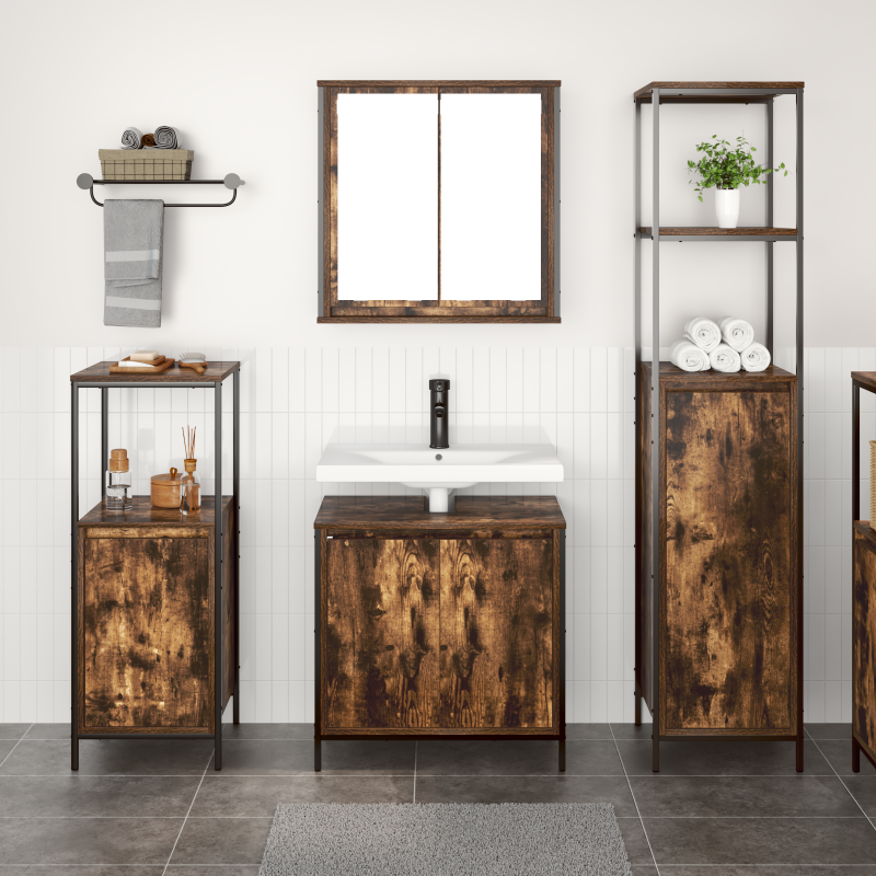 Dieses Badezimmermöbel Set verbindet stilvolles Design mit praktischer Aufbewahrung und erfüllt deine modernen Speicherbedürfnisse. Das coole Finish in geräucherter Eiche sorgt für Wärme und hilft, dein Badezimmer ordentlich und schick aussehen zu lassen. Viel Stauraum: Dieses Set hat einen Waschbecken Schrank und zwei hohe Schränke mit speziellen Plätzen für Handtücher, Toilettenartikel und mehr, damit alles seinen Platz hat und leicht zu erreichen ist. Moderne Ästhetik: Das schicke, minimalistische Design in geräuchertem Eichenfinish fügt sich perfekt in moderne Dekors ein und schafft eine einladende und entspannte Atmosphäre in deinem Badezimmer. Hochwertige Bauweise: Hergestellt aus robuster Spanplatte und einem Metallrahmen, ist jede Einheit langlebig und eine solide Ergänzung für dein Zuhause. Adaptierbare Nutzung: Perfekt für verschiedene Badezimmerlayouts bietet dieses Möbelset sowohl in großen Hauptbadezimmern als auch in gemütlichen Gäste-WCs super Möglichkeiten, ohne an Stil zu verlieren. Sicher und stabil: Um die Stabilität zu gewährleisten, sollten die hohen Schränke mit der beiliegenden Halterung an der Wand gesichert werden, was dir ein gutes Gefühl gibt, wenn Kinder oder Haustiere in der Nähe sind.