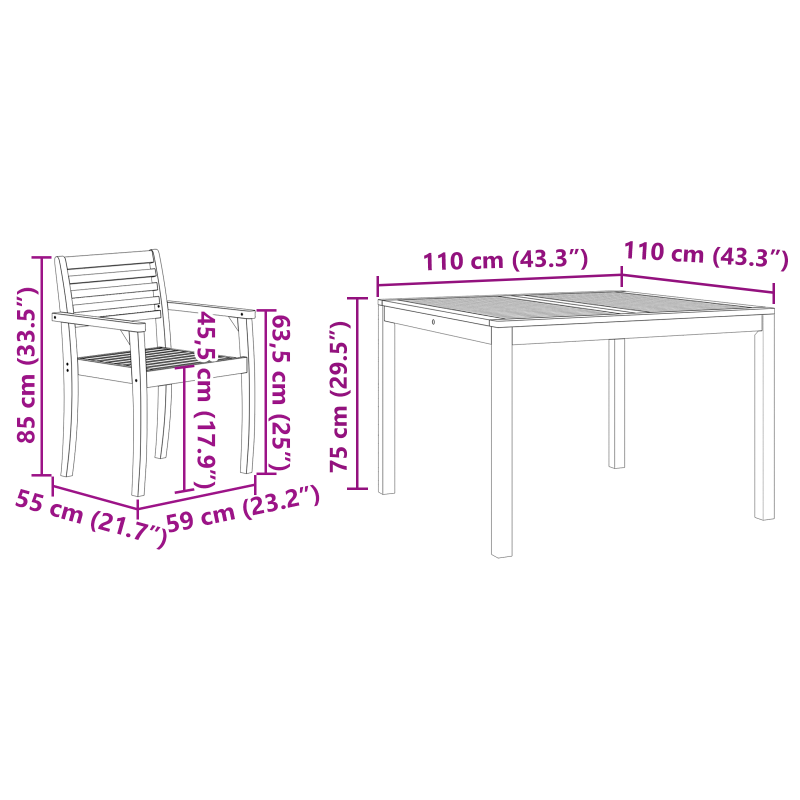 Diese rustikale Massivholz Akazien Garten-Essgruppe verwandelt deinen Außenbereich in einen gemütlichen Ort für Familienessen und Zusammenkünfte. Die tolle Verarbeitung zeigt die warmen Farbtöne des massiven Akazienholzes und schafft eine freundliche Atmosphäre, egal ob auf deiner Terrasse, deinem Balkon oder in deinem Garten. Robust und zuverlässig: Die massive Akazienholzplatte ist wetterfest und bietet langlebige Flächen für Essen und Entspannung. Komfort durch cleveres Design: Die Gartenstühle haben ein unterstützendes, lamelliertes Design, das Luftzirkulation und Komfort bietet. Einfache Pflege: Die Reinigung geht schnell; ein feuchtes Tuch reicht aus, um es frisch zu halten. Zeitlos und ansprechend: Das rustikale Design passt in jeden Kontext, ob traditionell oder modern. Frei und geräumig: Der 110 cm große Tisch bietet genug Platz für Essen oder zum Genießen von Kaffee mit Freunden.