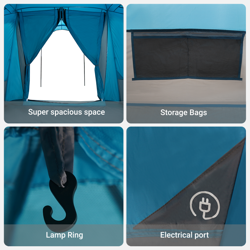 Dieses Campingzelt ist für Outdoor-Fans gemacht, die Komfort und Bequemlichkeit beim Abenteuer wollen. Es hat eine olle blaue Farbe und modernen Stil, eignet sich perfekt für deine Camping-Ausrüstung und bietet einen gemütlichen Platz für bis zu vier Personen. Außerdem schützt es dich vor Wind und Wetter. Robustheit: Hergestellt aus wasserdichtem Polyester, ist das Zelt ideal für jede Witterung und hält dich trocken und sicher beim Wandern. Einfache Lagerung: Lässt sich super leicht zusammenfalten, sodass du es bei all deinen Outdoor-Abenteuern dabei haben kannst. Bequeme Montage: Schneller Aufbau, damit du mehr Zeit für den Spaß hast. Geräumig: Mit 335 cm x 721 cm passt es bequem für vier Erwachsene. Komplettset: Kommt mit einer Tragetasche und Erdankern – also bist du perfekt für dein Camping-Abenteuer ausgestattet.