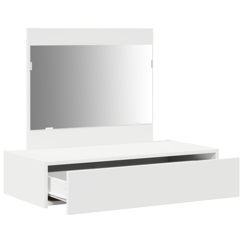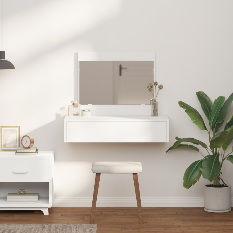 Dieser wandhängende Schminktisch kombiniert modernes Design mit praktischer Nutzung und ist eine tolle Ergänzung für jedes Schlafzimmer oder Pflegebereich. Seine schicke, glänzende weiße Oberfläche und die klaren Linien sorgen für einen stylischen Look und bieten gleichzeitig viele Funktionen für deine täglichen Pflegeaufgaben. Das wandmontierte Design spart Platz und hält alles ordentlich, während es einfachen Zugriff auf deine Pflegeutensilien bietet. Eine große Schublade sorgt dafür, dass deine Kosmetika und Zubehör gut organisiert sind. Der flache Spiegel sorgt für ein tolles Pflegeerlebnis und reflektiert das Licht, sodass dein Raum hell und einladend wirkt. Hergestellt aus hochwertigem Holzwerkstoff, sieht dieser Schminktisch toll aus und ist darauf ausgelegt, lange zu halten, ohne seinen Charme zu verlieren. Mit 83 cm Länge, 40 cm Breite und 70 cm Höhe bringt er die optimale Balance zwischen Größe und Funktionalität mit und passt zu verschiedenen Raumstilen.