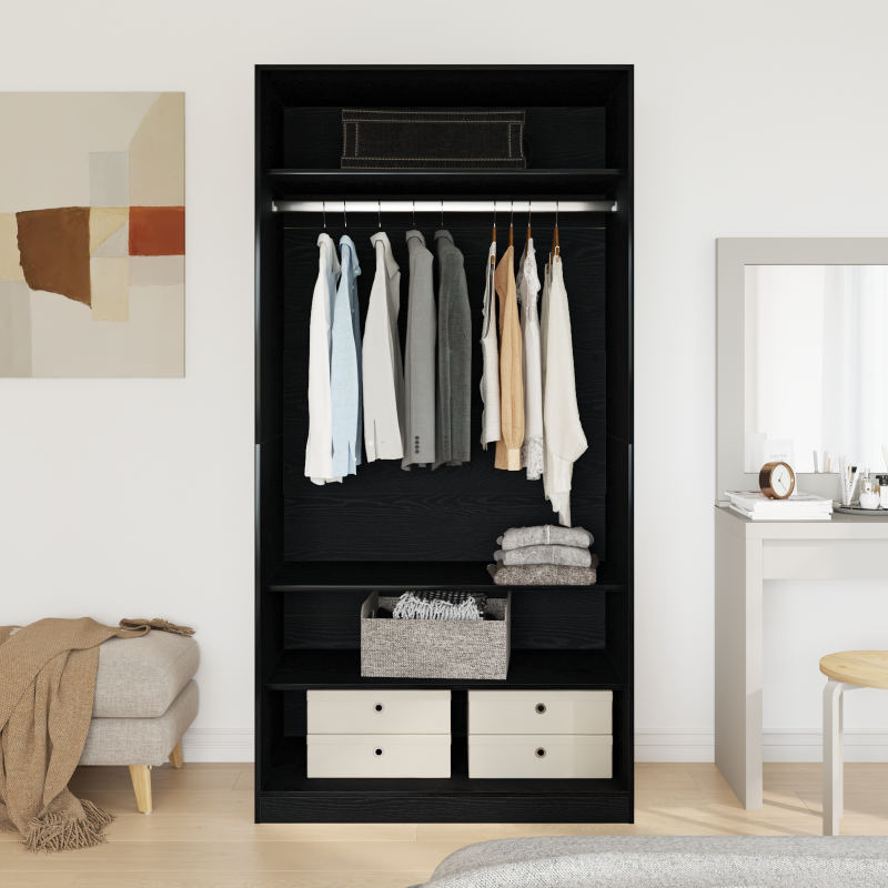 Dieser moderne Kleiderschrank aus schwarzer Eiche verbindet Stil und Praktikabilität perfekt. Er ist ideal für jedes trendige Schlafzimmer. Das schlanke schwarzes Finish und die klaren Linien bringen Eleganz in deinen Raum und bieten viel Stauraum für Kleidung und Accessoires. Langlebige Konstruktion: Der Kleiderschrank aus Holzwerkstoff hält dir viele Jahre die Treue, perfekt für den täglichen Gebrauch. Stylisches schwarzes Finish: Die glatte Oberfläche sieht schick aus und lässt sich leicht in verschiedene Einrichtungsstile integrieren, was das Gesamtbild deines Raums aufwertet. Viel Stauraum: Mit insgesamt vier Fächern und drei Regalen behältst du den Überblick über deine Sachen und hast alles griffbereit – das sorgt für einfacheren Alltag. Einfache Montage: Er lässt sich super leicht zusammenbauen, und dafür brauchst du nur zwei Personen, um ihn schnell in Betrieb zu nehmen. Perfekt für unterschiedliche Räume: Ideal für drinnen, passt dieser Kleiderschrank prima ins Schlafzimmer, Wohnräume oder Home-Offices und integriert sich problemlos in deinen Alltag.