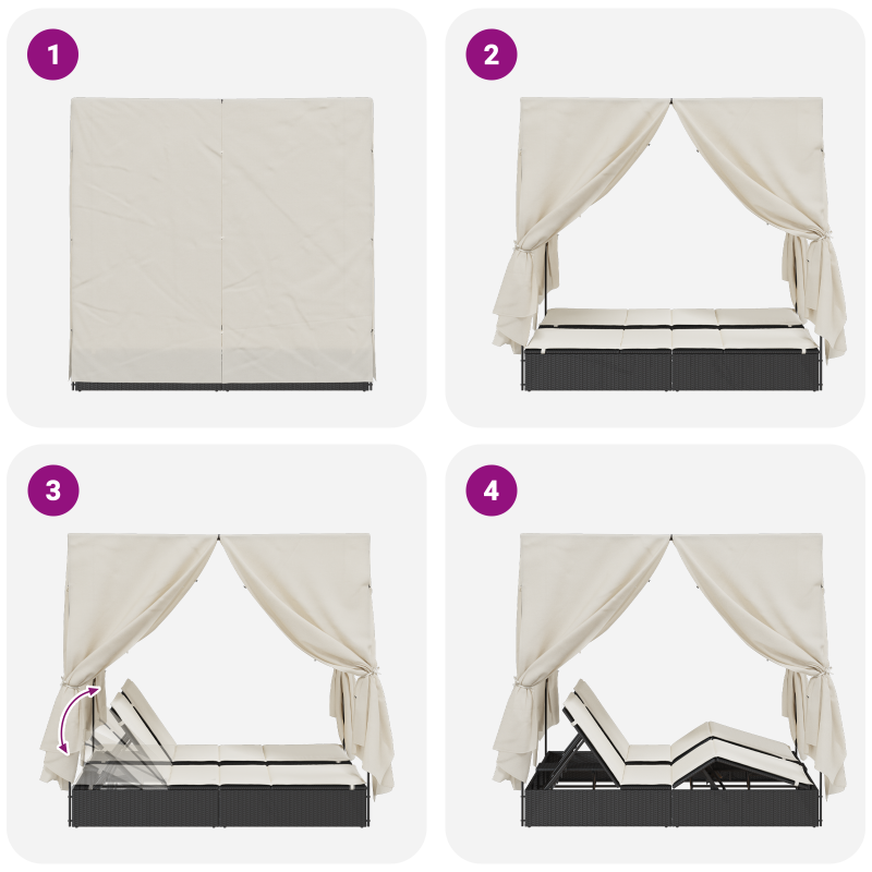 Dieses modulare Outdoor Liegebett ist die perfekte Wahl für alle, die draußen entspannen wollen. Mit seinem schicken Schwarz und Creme passt es super zu verschiedenen Außenbereichen und ist ideal für Gärten, Dachterrassen oder ruhige Balkone, wo Komfort und Stil sich treffen. Die verstellbaren Rückenlehnen lassen jeden seinen bequemen Platz finden, egal ob zum Sonnenbaden oder Lesen. So verbessert sich deine Chill-Zeit enorm, denn du kannst in jedem Winkel entspannen, der dir am besten passt. Das zusammenklappbare Design macht die Lagerung super einfach. Du kannst es schnell wegpacken, ohne zu viel Platz zu beanspruchen, wenn du es nicht brauchst, was dir Flexibilität gibt. Dieses modulare Bett sieht modern aus und passt bestens zu zeitgenössischer Außendekoration, also ist es nicht nur praktisch, sondern bringt auch etwas Stil in deinen Raum. Hergestellt aus robusten, UV- und wasserbeständigen Materialien hält es den Bedingungen draußen stand; so kannst du beruhigt relaxen. Es sorgt für Spaß und Komfort, wo auch immer du draußen bist. Komplett mit einem Sonnenschutz für Schatten, damit du auch an sonnigen Tagen komfortabel bleibst, ideal zum Chillen am Pool oder für tolle Gespräche bei Gartenpartys.