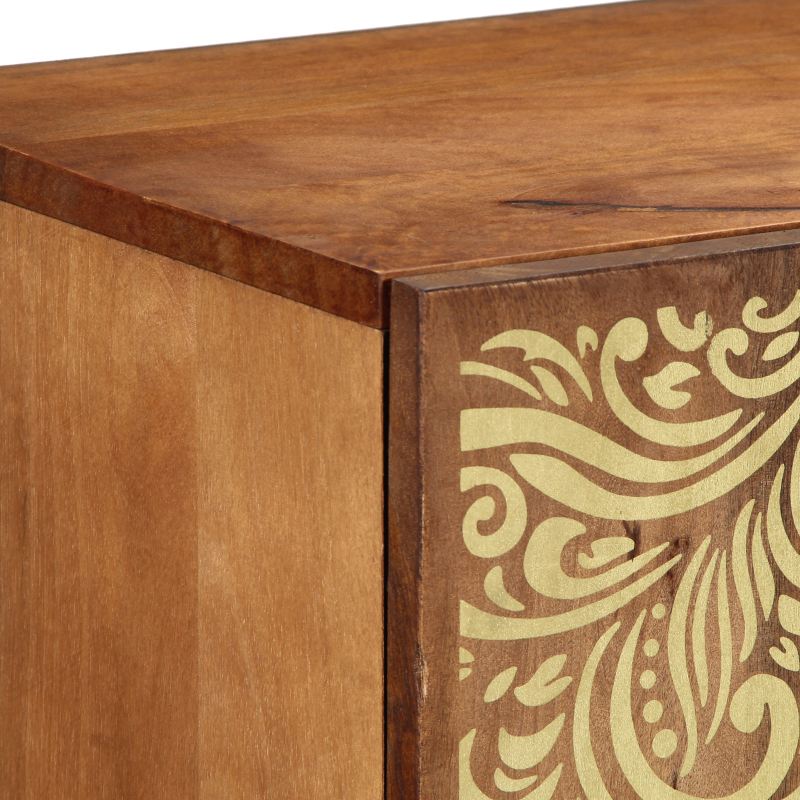 Dieses Sideboard hat einen schicken Stil und wertet deinen Wohnraum auf. Es besteht aus massivem Akazienholz, und das honigbraune Finish passt super zu den polierten dekorativen Intarsien in metallischem Gold. Es sorgt für einen einladenden Look. Stylisches Design: Die Blumenmuster verleihen jeder Dekoration einen einzigartigen Touch. Robuste Konstruktion: Aus haltbarem massivem Akazienholz für langfristigen Einsatz. Verstellbare Regale: Passe deinen Stauraum an, um Mediengegenstände ordentlich unterzubringen. Praktische Größe: Genau richtig, um in verschiedene Wohnräume zu passen. Poliertes Finish: Der Glanz hebt den Gesamteindruck des Stücks hervor.