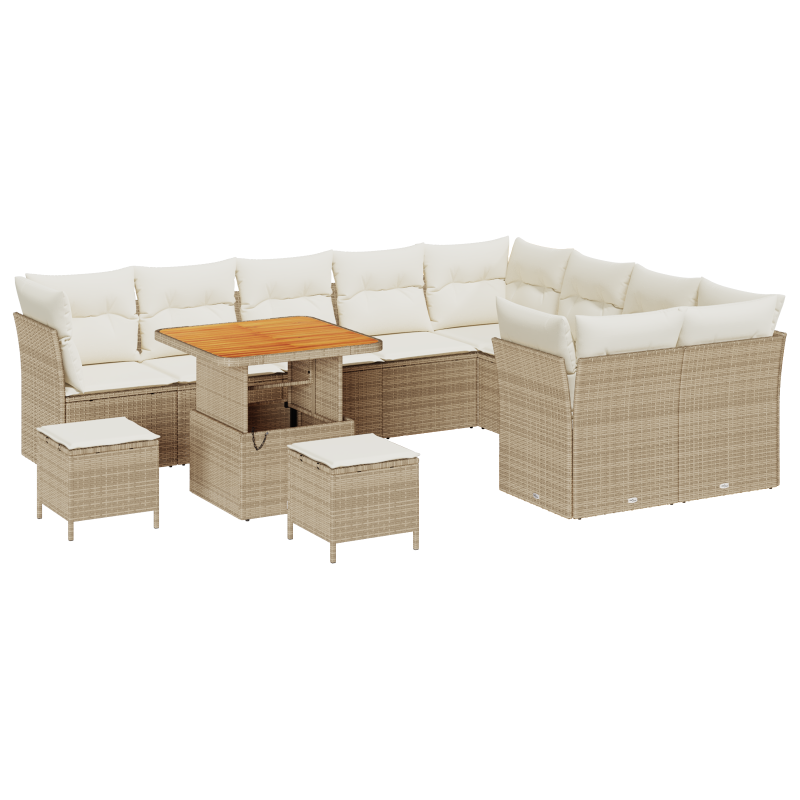 Dieses schöne 12-teilige Garten Sofa Set kombiniert Funktionalität mit Stil und peppt jeden Außenbereich auf. Es verbindet beiges natürliches Rattan mit cremeweißen Kissen und sorgt für Komfort sowie eine angenehme Atmosphäre, ideal zum Entspannen an sonnigen Tagen oder zum Verweilen mit Freunden am Abend. UV-Beständigkeit: Hergestellt aus Materialien, die gegen UV-Licht schützen, damit es gut aussieht und der Sonne standhält. Das bedeutet, dass es sein tolles Aussehen und seine Form lange behält, was den üblichen Verschleiß bei Gartenmöbeln minimiert. Bequeme Kissen: Jedes Kissen lässt sich abnehmen und hat einen Reißverschluss, was die Reinigung oder den Austausch einfach macht. Sie sind mit bequemen Schaumstoff gefüllt, perfekt zum Entspannen an sonnigen Nachmittagen. Geräumige Sitzplätze: Das Sofa Set bietet bequem Platz für 5 Personen, ideal für Familientreffen oder um Freunde draußen zu bewirten. Es gibt genug Platz für alle, ohne dass man sich eingeengt fühlt, was eine freundliche Atmosphäre schafft. Zeitgenössischer Stil: Die schlanken Linien und das moderne Design machen dieses Sofa Set zu einer tollen Ergänzung für jeden Garten, Terrasse oder Balkon. Das Design hat einen trendigen Touch, der in jede Außendekoration passt. Robuste Konstruktion: Leicht und dennoch stabil, der Rahmen besteht aus hochwertigem Rattan mit einer matten Oberfläche für einen eleganten Look. Diese solide Bauweise bedeutet, dass du dieses stilvolle Stück genießen kannst, ohne dir Sorgen über Abnutzung oder Wackeln machen zu müssen.