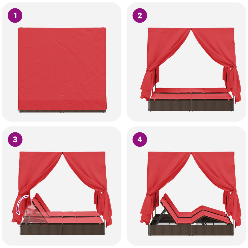 Dieses schicke Outdoor-Liegenbett bringt Stil und Komfort in deinen Garten oder Balkon. Aus robustem Poly-Rattan in warmem Braun und kräftigem Rot, es passt super in verschiedene Außenbereiche - perfekt für entspannte Momente mit Familie oder Freunden. Die verstellbaren Rückenlehnen helfen dir, die perfekte Liegeposition zu finden, egal ob du aufrecht sitzt oder flach liegst, während du die Sonne genießt oder ein gutes Buch liest. Diese Sonnenliege hat ein stylisches Dach, das dir schönen Schatten bietet und deine Entspannungszeit noch angenehmer macht. Hergestellt aus robusten Materialien, die gegen UV-Strahlen und Wasser geschützt sind, hält dieses Liegenbett jedem Wetter stand und sieht gut aus, damit du es lange genießen kannst. Mit 200 x 160 x 90 cm ist genug Platz für zwei Erwachsene, also ideal für Paare und Freunde, die zusammen chillen wollen. Dank des vielseitigen Designs fügt es sich super in Gärten, Terrassen und am Pool ein und sorgt dafür, dass du draußen überall ein tolles Liegegefühl hast.