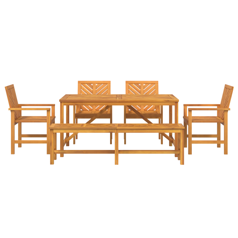 Dieses Garten-Essset kombiniert Praktikabilität mit modernem Design, perfekt um deinen Außenbereich aufzupeppen. Gefertigt aus solidem Akazienholz, hat es einen geräumigen rechteckigen Tisch, eine stabile Bank und vier stylische Stühle, die alle für den Komfort beim Essen im Freien gedacht sind. Haltbares Material: Dieses Garten-Essset besteht aus solidem Akazienholz, das wetterfest ist. Schlichtes Design: Der moderne Stil mit seinen einfachen Linien passt perfekt in jedes Außenambiente. Bequeme Sitzmöglichkeiten: Mit Platz für 6 Personen ist es ideal für lebhafte Familienessen oder entspannte Zusammenkünfte. Lackierte Oberfläche: Die glatte, lackierte Oberfläche sieht toll aus und ist leicht zu reinigen, was ein schickes Esserlebnis im Freien bietet. Praktische Nutzung: Ideal für Gartenpartys, Picknicks oder einfach für lockere Mahlzeiten draußen.